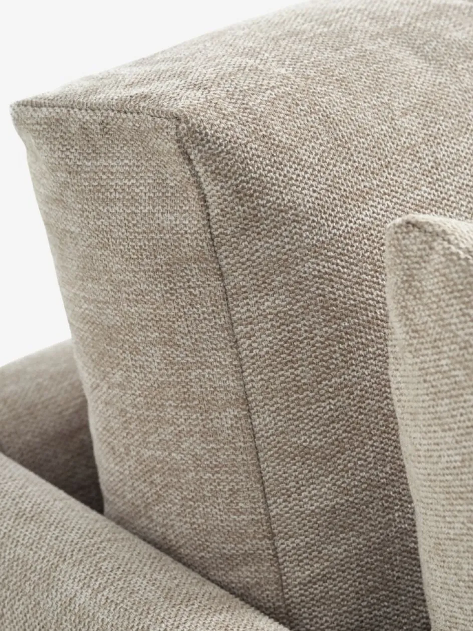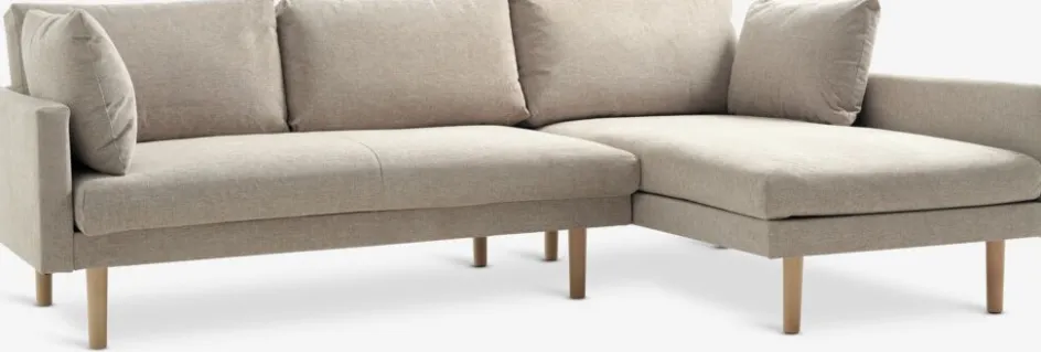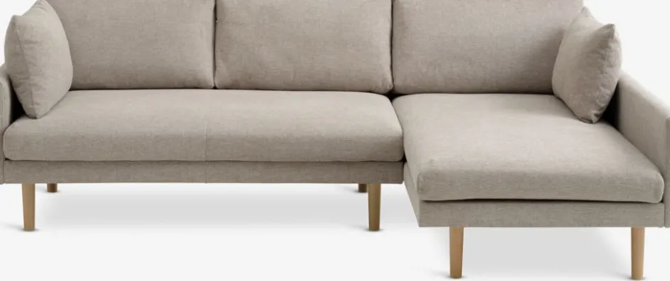 Structure : MDF, panneau de particules, contreplaqué, pin massif. Garnissage : mousse polyuréthane (siège : 22/28/30 kg/m³ kg/m³). Revêtement : polyester. Pieds : bouleau massif. Non réversible. 2,5 places. l244 x H84 x P95/157 cm