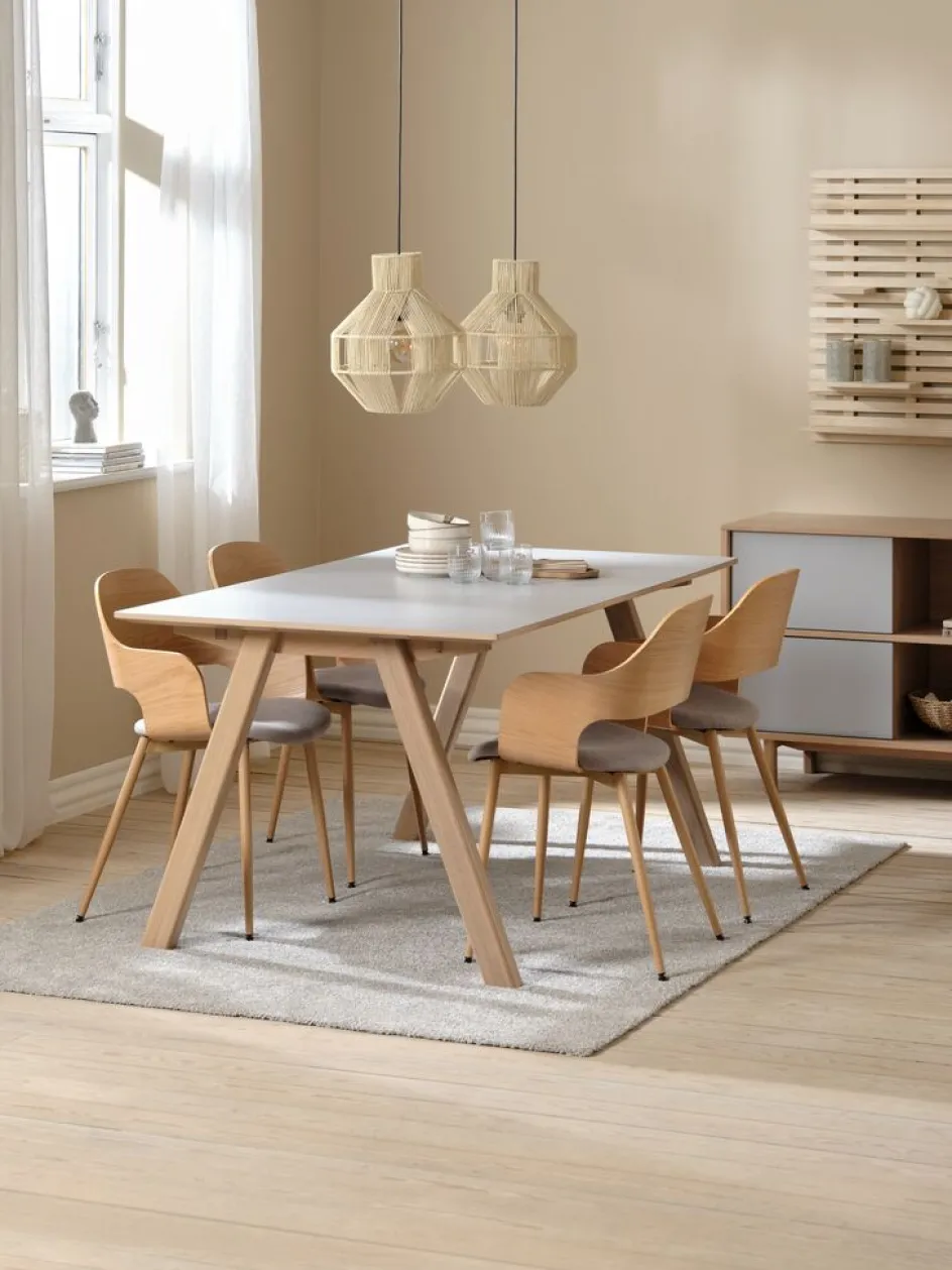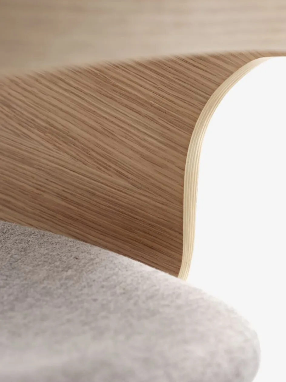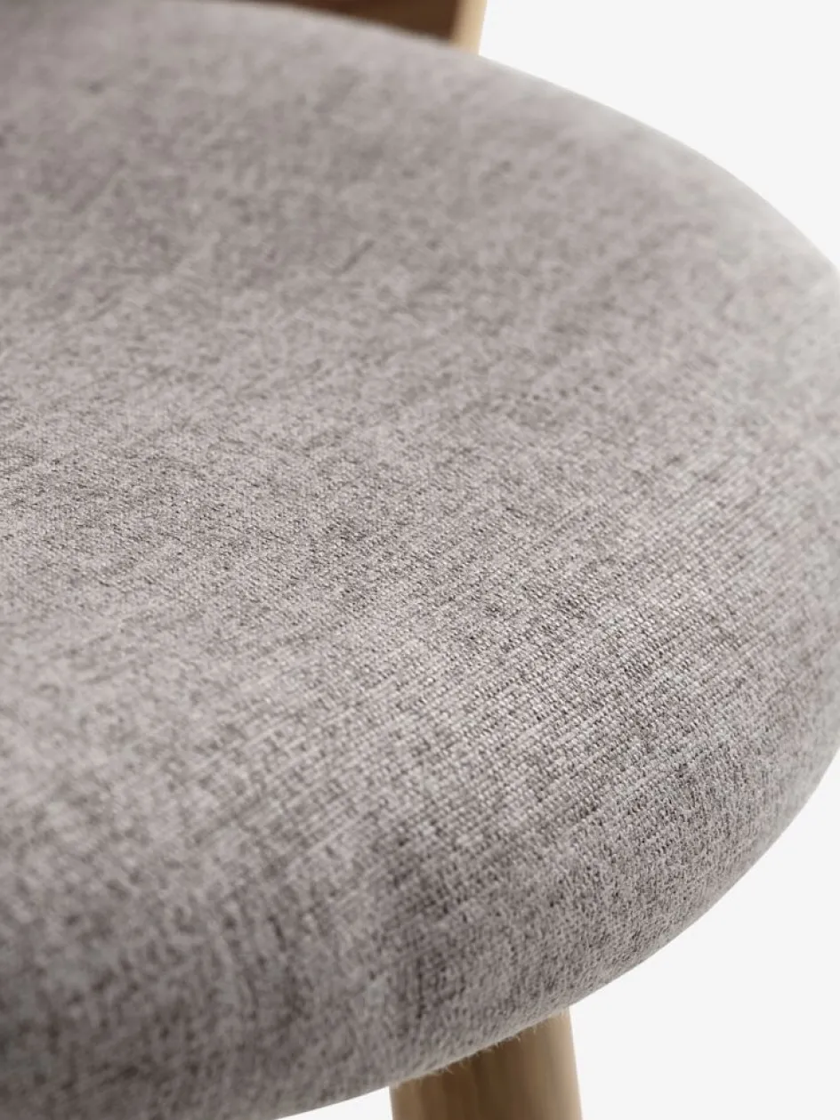 Chaise de salle à manger avec accoudoirs offrant un soutien et un confort supplémentaires. La chaise possède une assise rembourrée en tissu gris clair et un dossier incurvé en placage chêne clair. Le bois est laqué pour une plus grande durabilité. Pieds en acier aspect chêne.