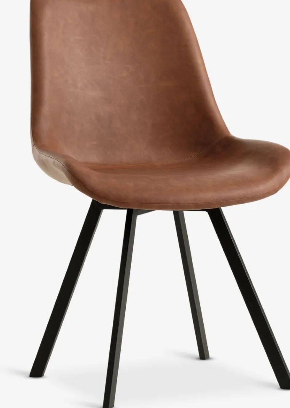 Chaise de salle à manger avec assise rembourrée et dossier cognac. Base pivotante en acier noir permettant de tourner la chaise facilement.