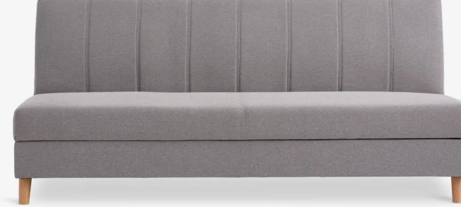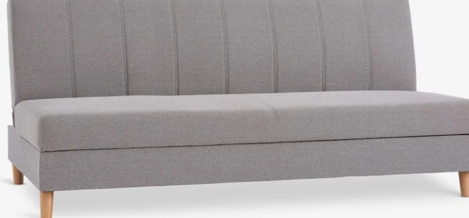 En contreplaqué, acier. Garnissage : mousse polyuréthane (28 kg/m³), ressorts. Revêtement : polyester. Pieds : bois de caoutchouc massif. 3 places. Avec espace de rangement. Se convertit facilement en lit 114×192 cm. l192 x H85 x P97 cm