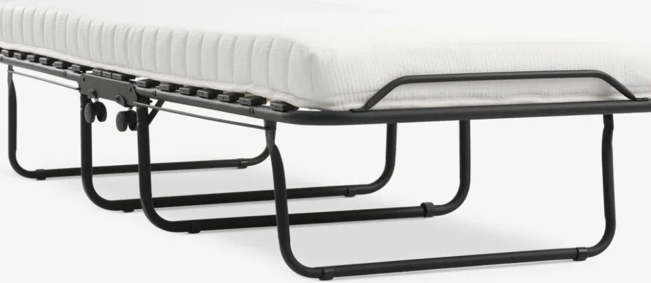 Cadre en acier. Lattes en placage bouleau. Garnissage matelas : mousse à mémoire de forme en polyuréthane (33 kg/m³) et mousse polyéther. Enveloppe : 100% polyester. Pliable. l80 x L193 x H45 cm