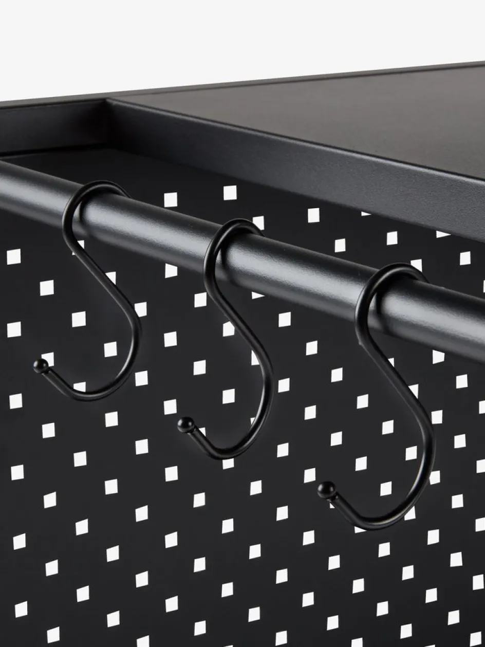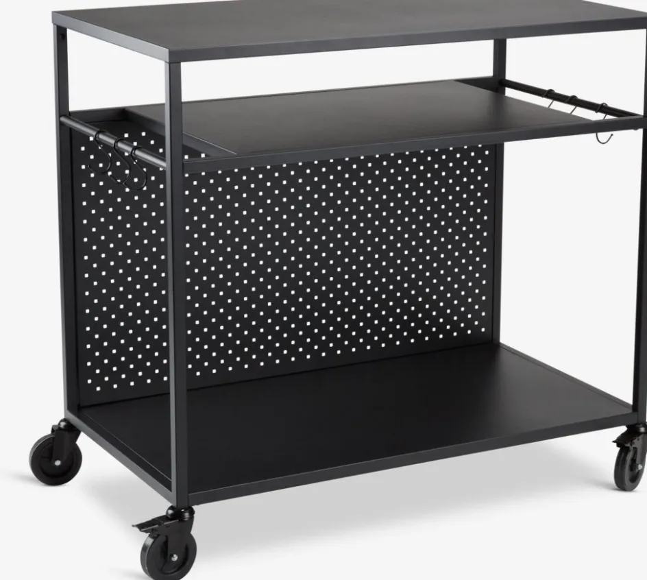 Table de barbecue noire avec un cadre et un plateau en acier peint par poudrage. Elle peut être utilisée comme base pour un barbecue à gaz de table et est idéale pour organiser les ustensiles et les ingrédients lors de la cuisine en extérieur. Les 2 roues facilitent le déplacement de la table. Incl. 6 crochets. l50 x L90 x H84 cm