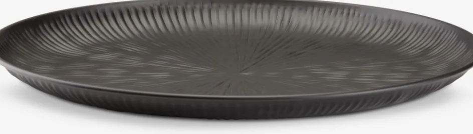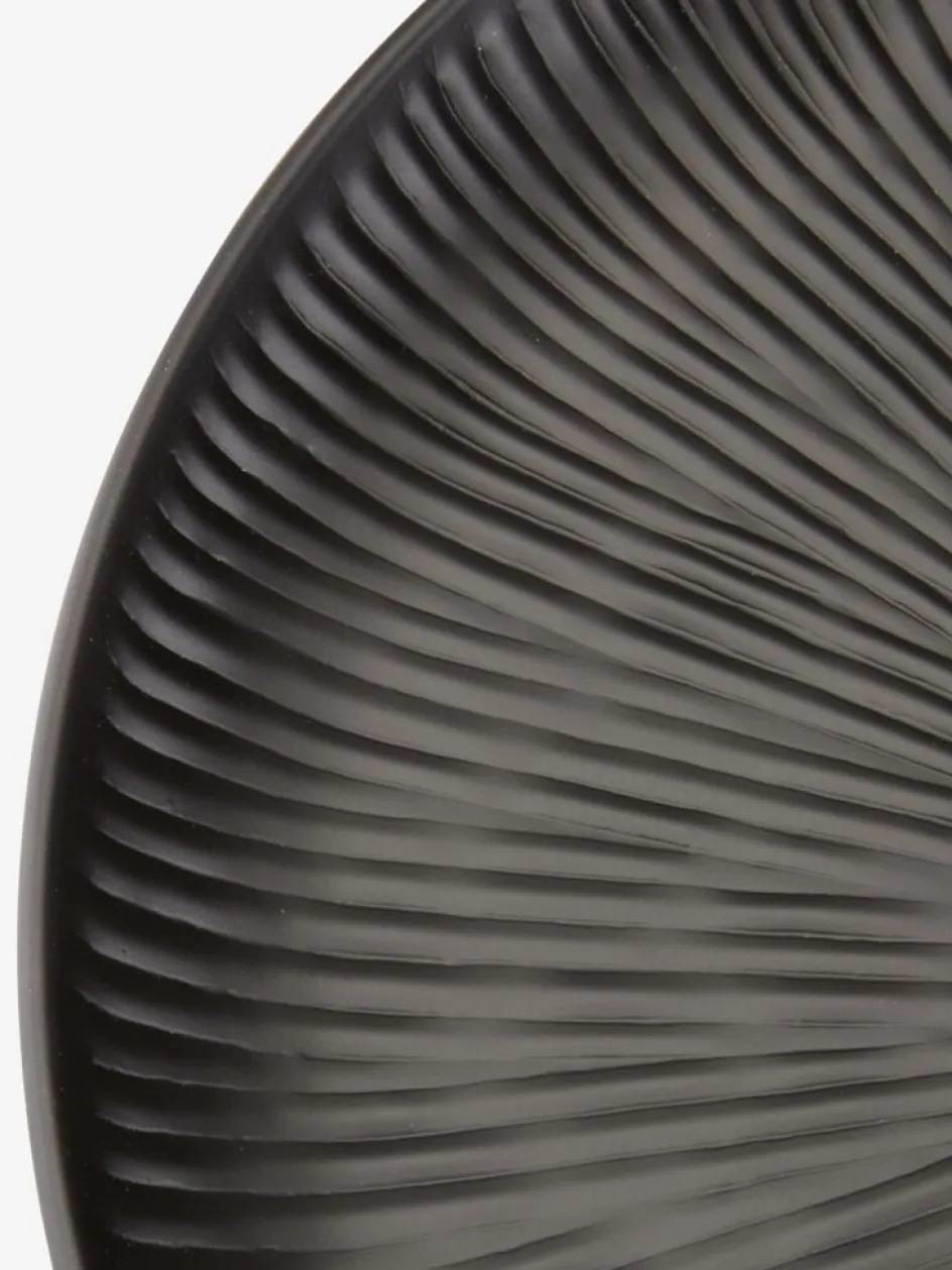 Plateau décoratif noir en acier à la forme ronde moderne et au motif subtil cannelé. Idéal pour organiser de petits objets pratiques ou exposer élégamment des éléments décoratifs sur une table. Ø39 x H2 cm
