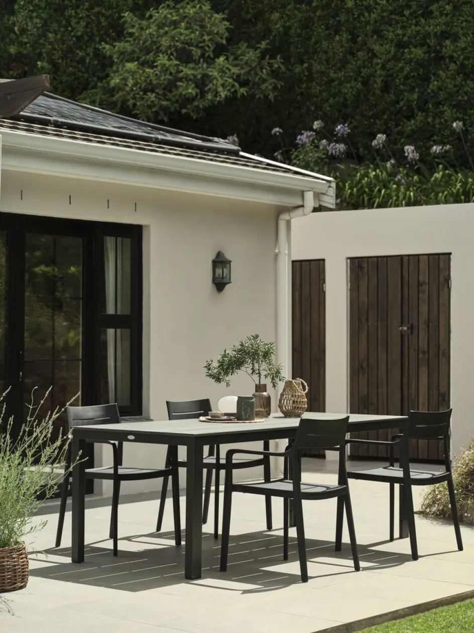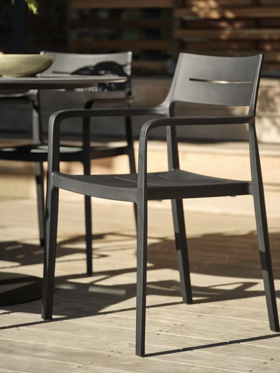 Chaise empilable noire en plastique (20% recyclé), qui est résistant aux UV pour empêcher que sa couleur ne s’estompe. La chaise de jardin peut être empilée pour un rangement compact.