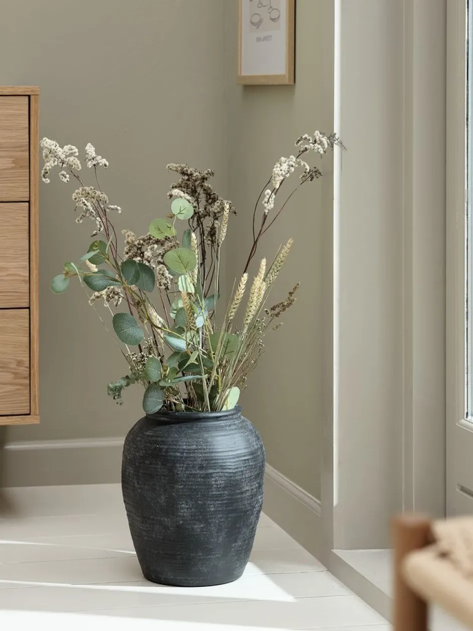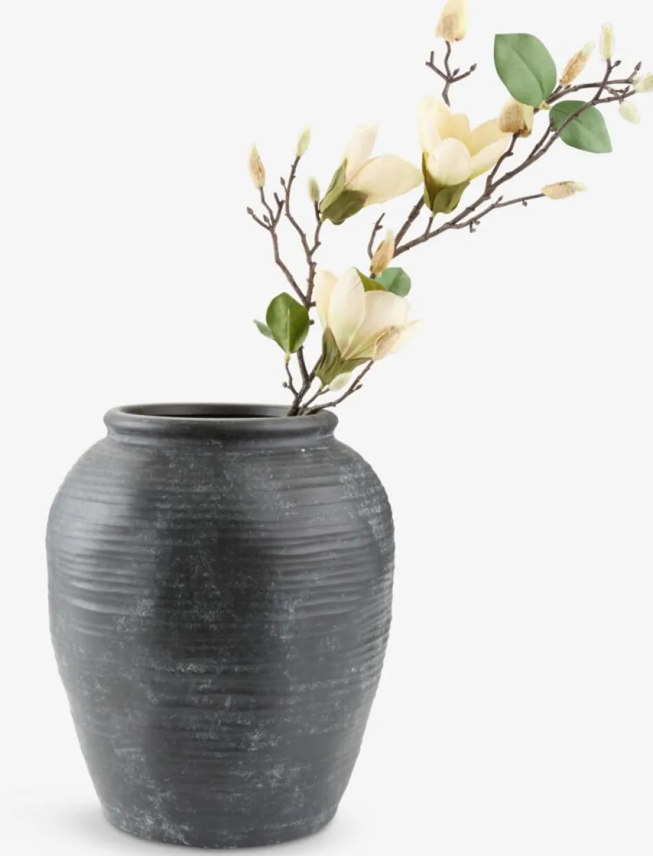 Vase noir en grès de forme large et d’apparence brute. Une pièce moderne pour votre décoration intérieure. Ø25 x H30 cm