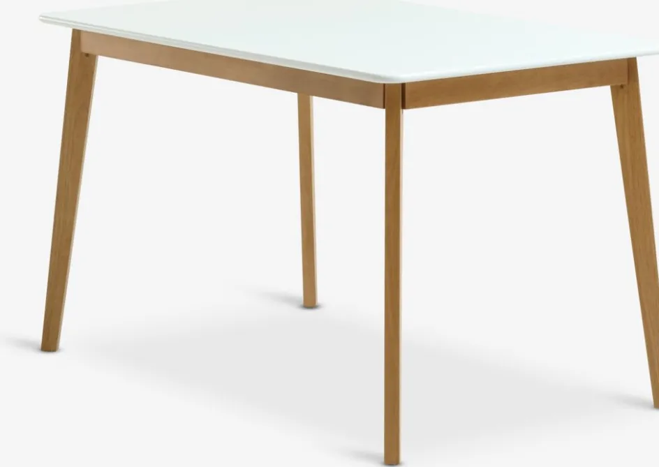 Table de salle à manger avec plateau de table blanc en MDF et pieds en bois massif. Le bois est laqué pour une plus grande durabilité. l80 x L130 x H75 cm