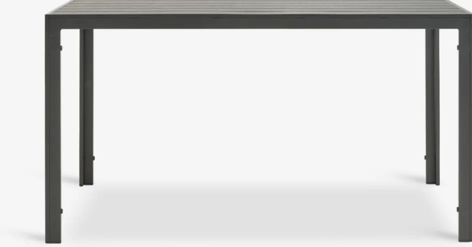 Table de jardin noire avec plateau en imitation bois. Cadre et pieds en aluminium peint par poudrage. L’imitation bois a l’apparence et la texture du bois naturel sans nécessiter d’entretien. L’aluminium est un matériau léger et robuste qui ne rouille pas. l80 x L140 x H74 cm