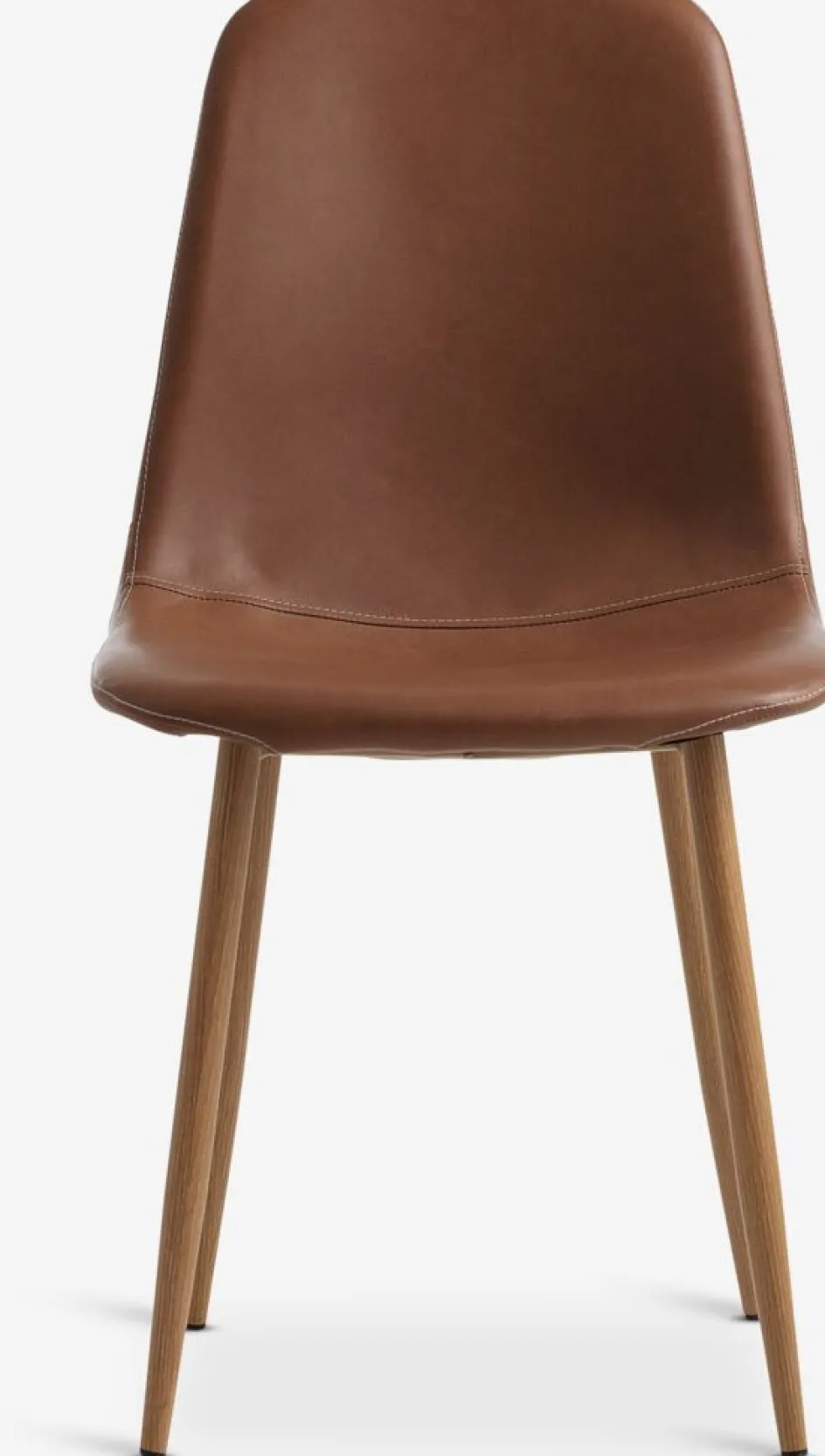 Chaise de salle à manger avec assise rembourrée et dossier coloris cognac. Pieds en acier aspect chêne.
