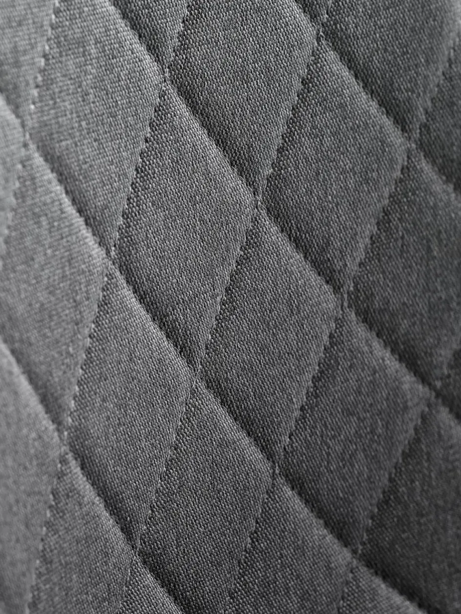 Chaise de salle à manger avec assise et dossier rembourrés en tissu gris asphalte. Pieds en acier aspect chêne.