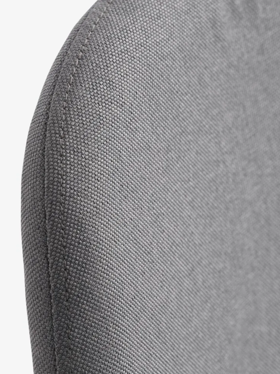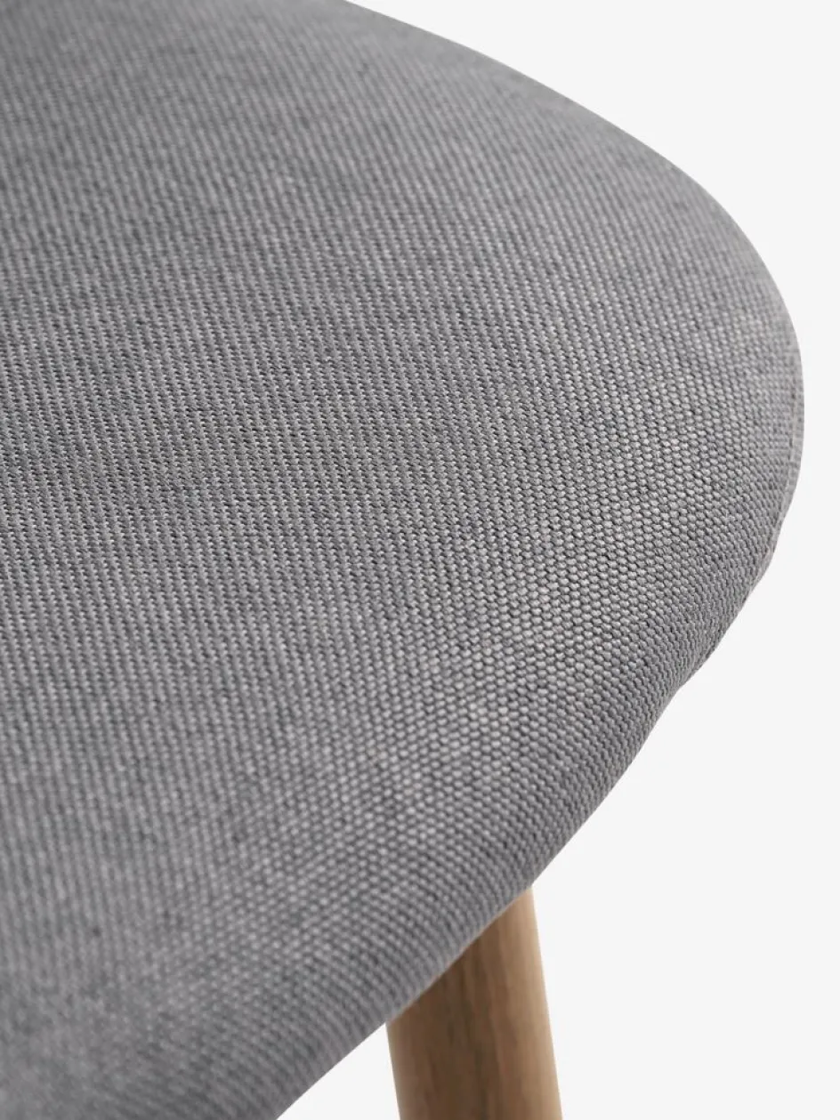 Chaise de salle à manger avec assise et dossier rembourrés en tissu gris. Pieds en acier aspect chêne.