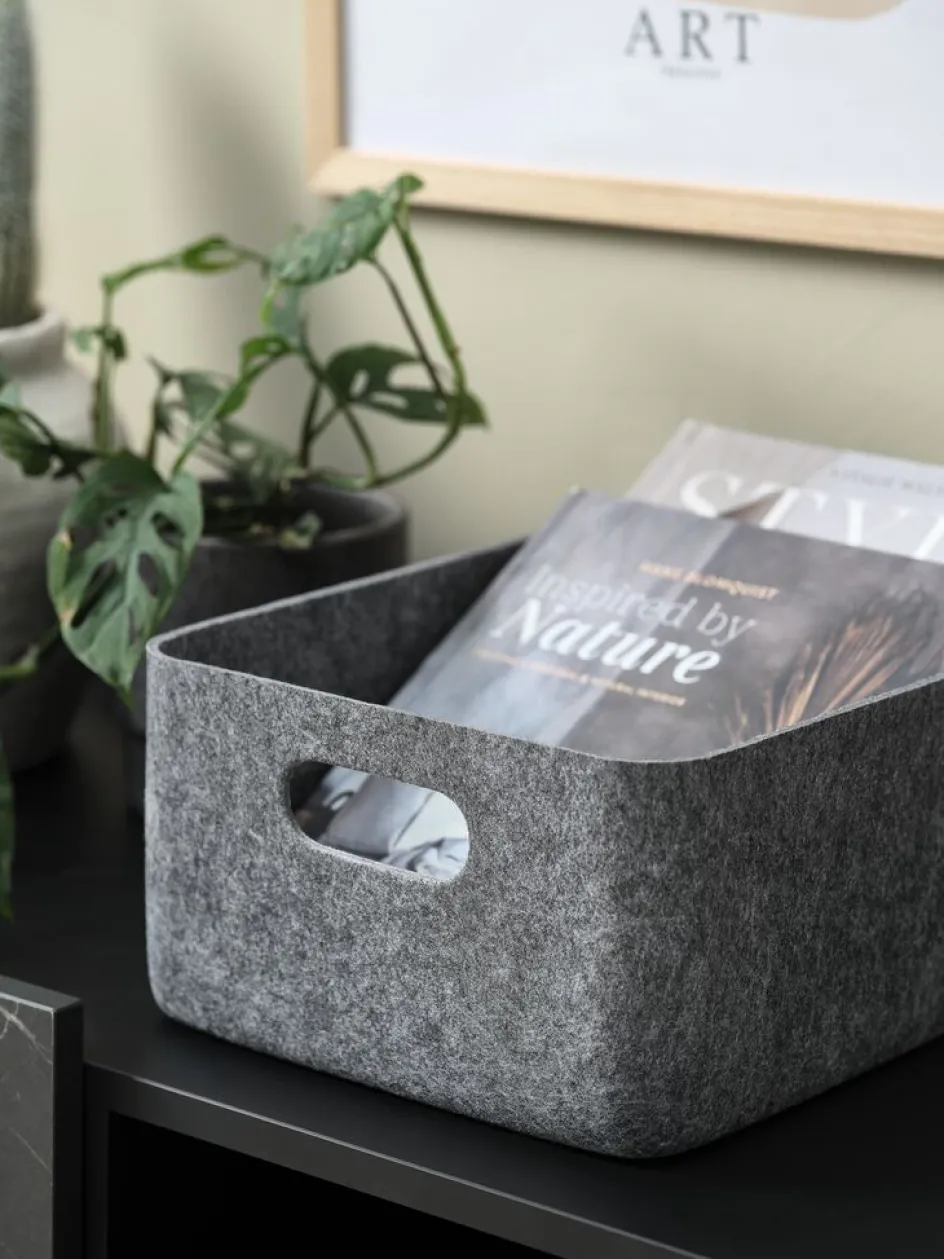 Panier en feutre gris avec un design simple et minimaliste. Convient pour une organisation et un rangement polyvalents à la maison. l25 x L33 x H14 cm
