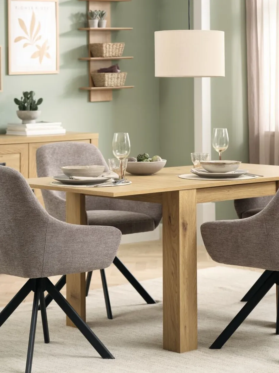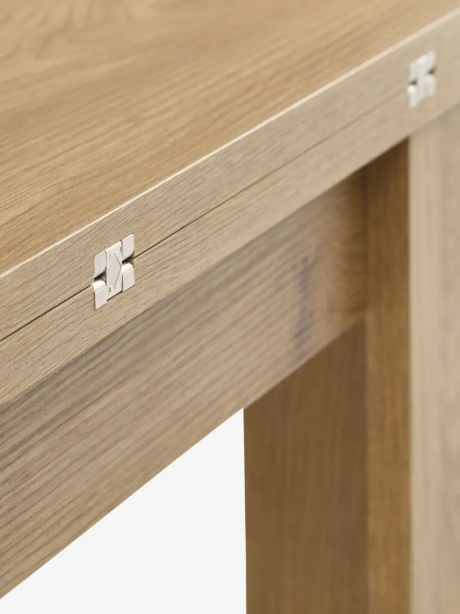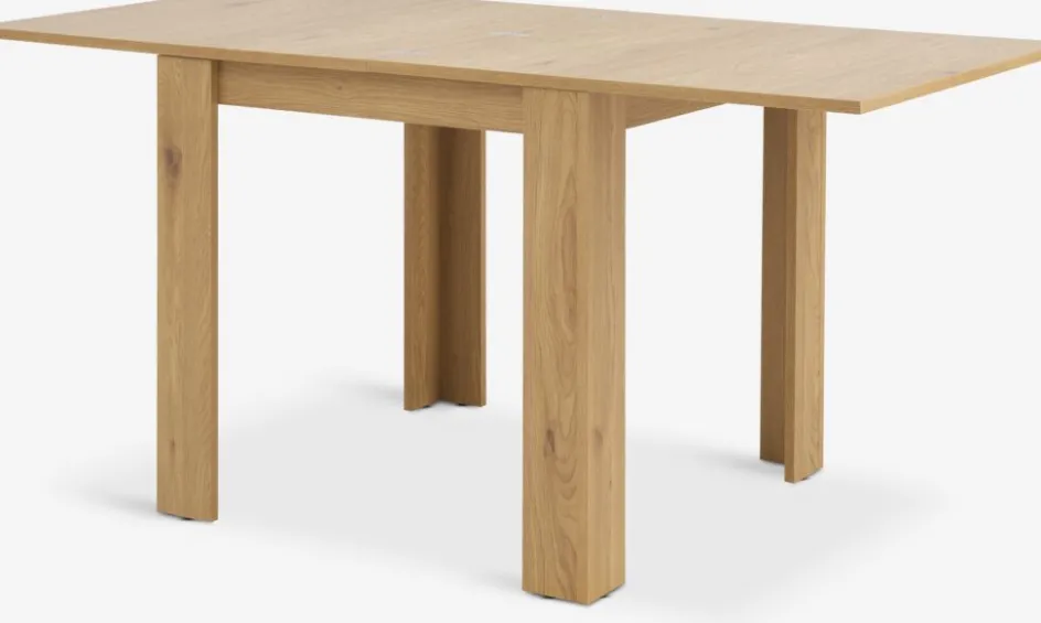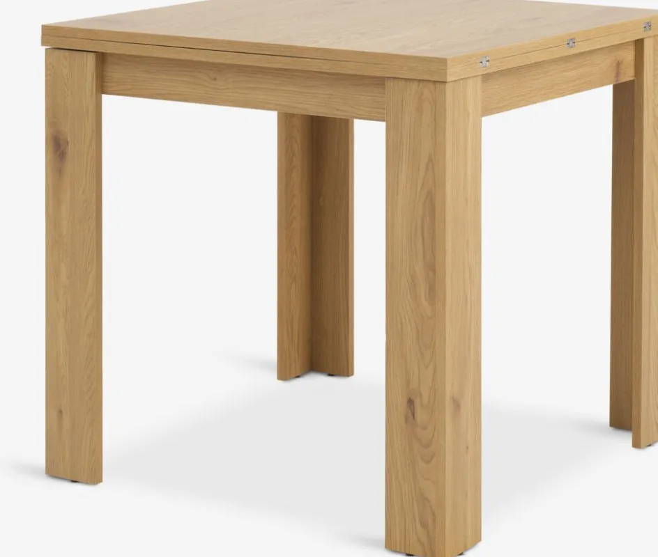 Table de salle à manger en placage décoratif aspect chêne. Le plateau dépliant permet de doubler facilement la taille de la table jusqu’à 160 cm. l80 x L80 x H76 cm