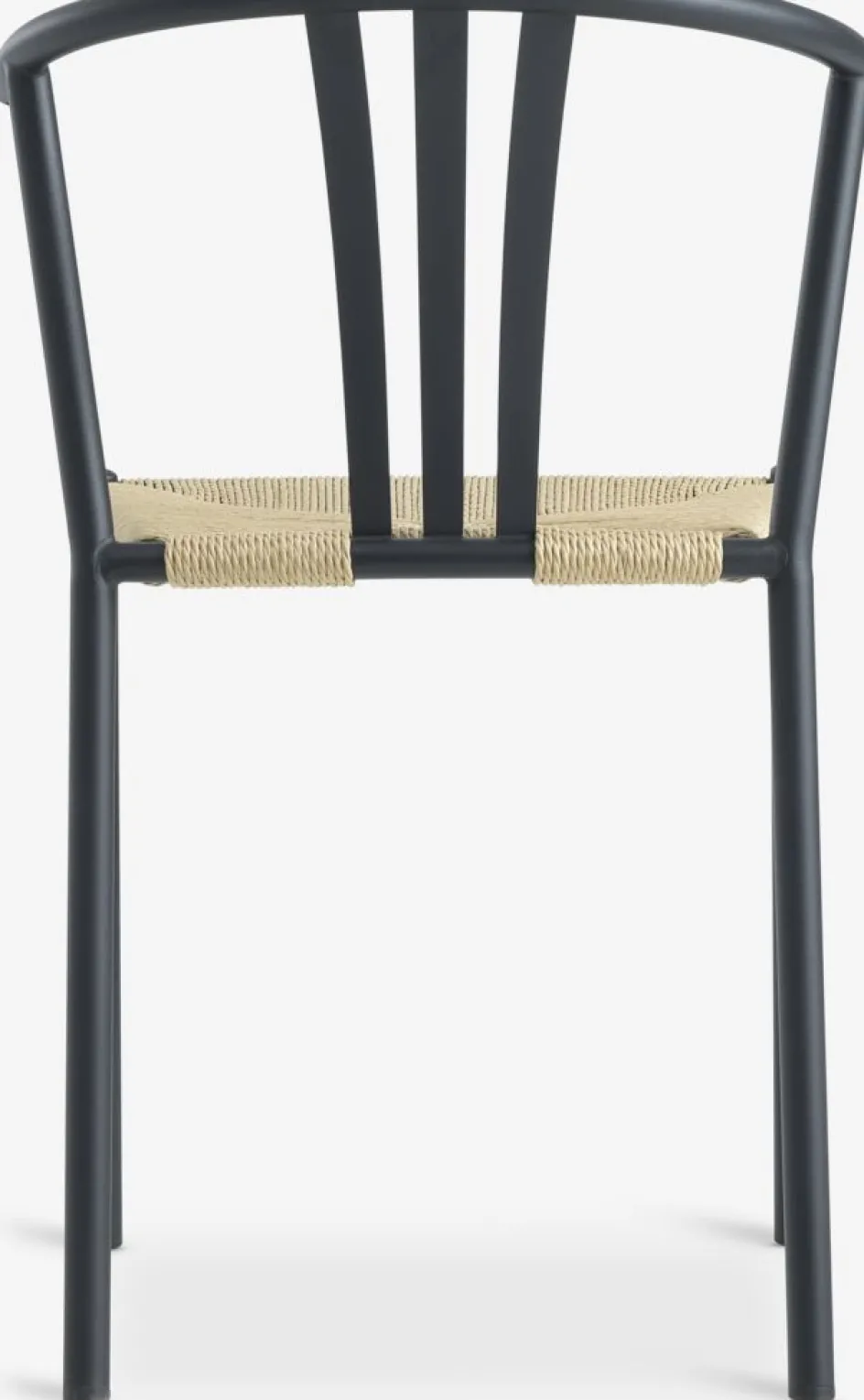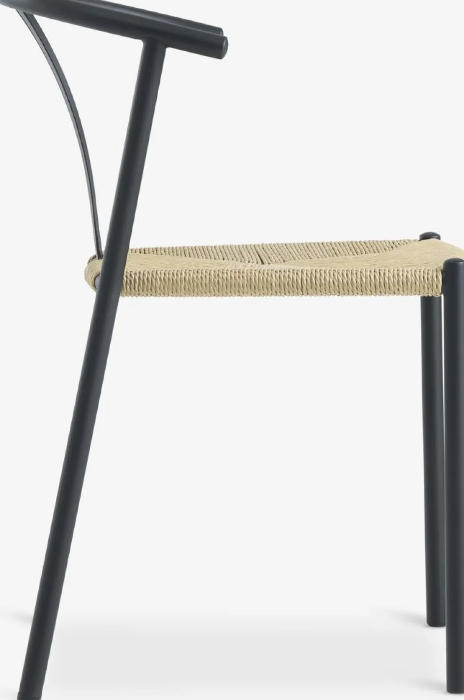 Chaise de salle à manger avec assise en corde de papier tressée. Cadre en acier noir avec dossier incurvé.