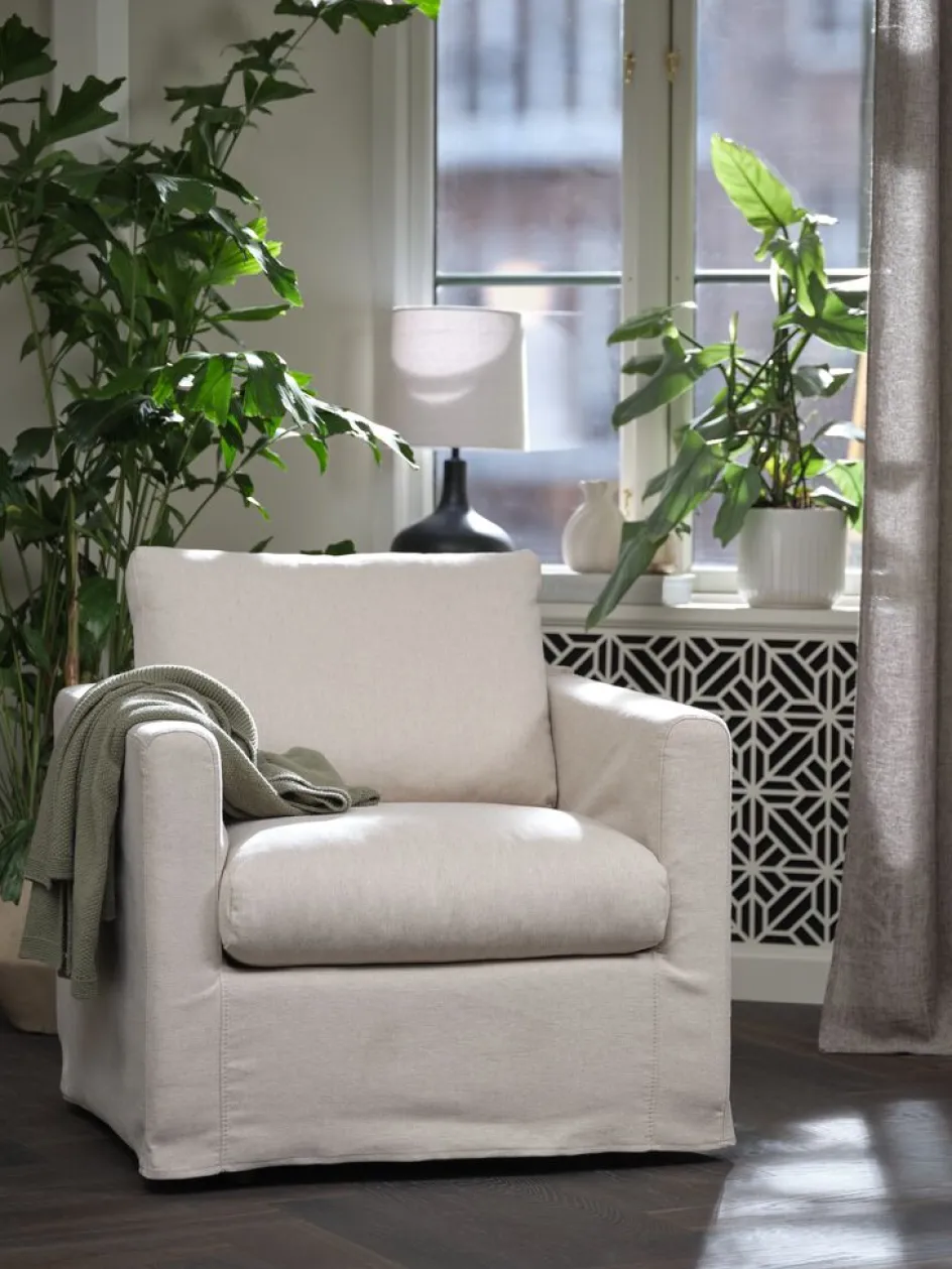 Tissu. Coussins d’assise et de dossier en mousse. Housse amovible. l84 x H89 x P89 cm