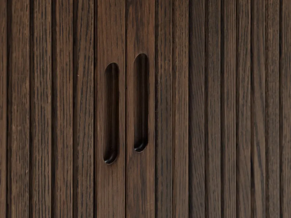 Chêne massif, placage chêne et placage décoratif. Avec portes coulissantes tambours. l160 x H80 x P40 cm