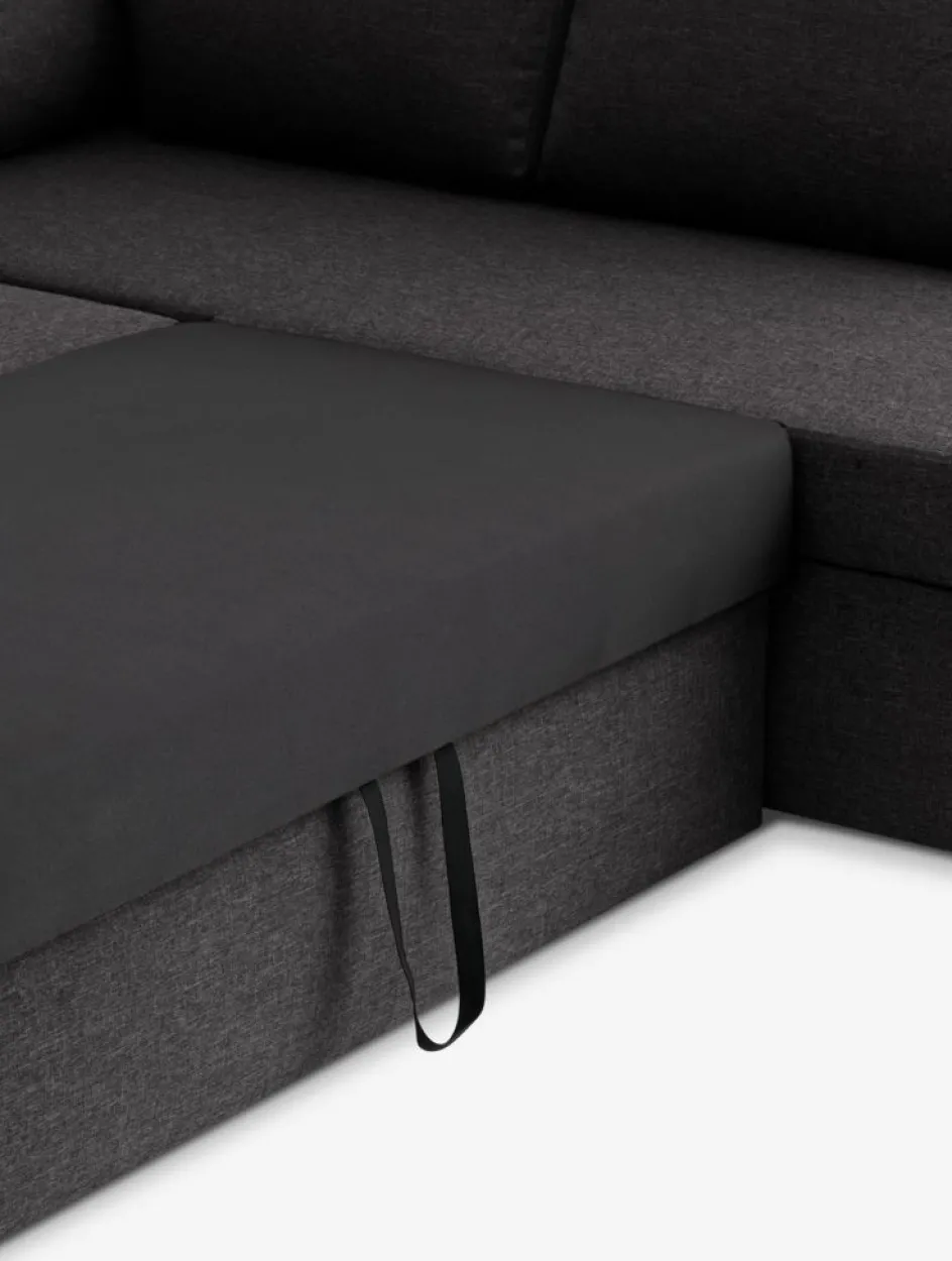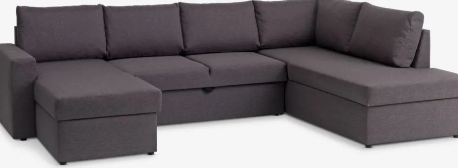 Structure : panneau de particules, pin massif. Garnissage : mousse polyuréthane (25 kg/m³). Revêtement : polyester. Pieds : plastique. Avec espace de rangement. Non réversible. Se convertit facilement en lit. Couchage : 140×265 cm. 6 places. l286 x H83 x P83/191 cm