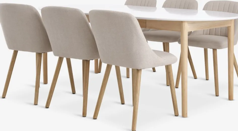 Table: Bois massif et MDF. Ø110 x H75 cm. Incl. 2 rallonges. Taille en extension l110 x L200 x H75 cm. Chaise: Tissu et bois massif.