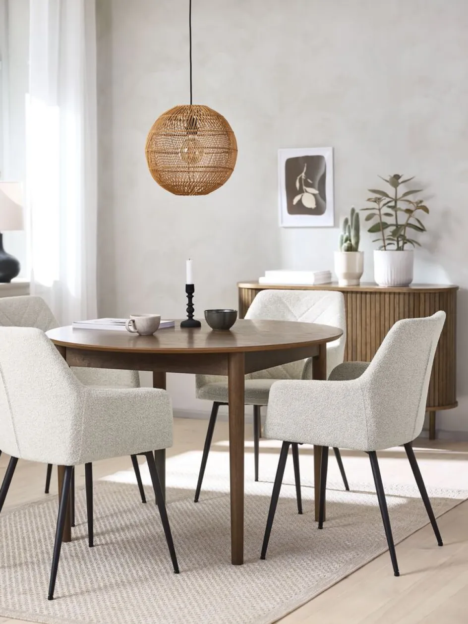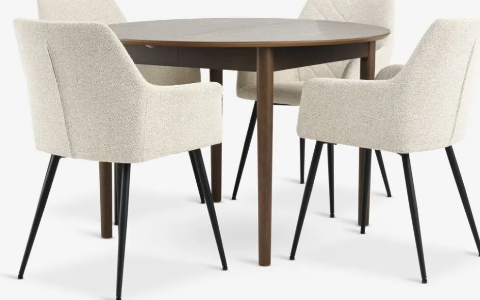 Table: Bois massif et placage chêne. Ø110 x H75 cm. Incl. 2 rallonges. Dimensions avec rallonges: l110 x L200 x H75 cm. Chaise: Tissu et acier.