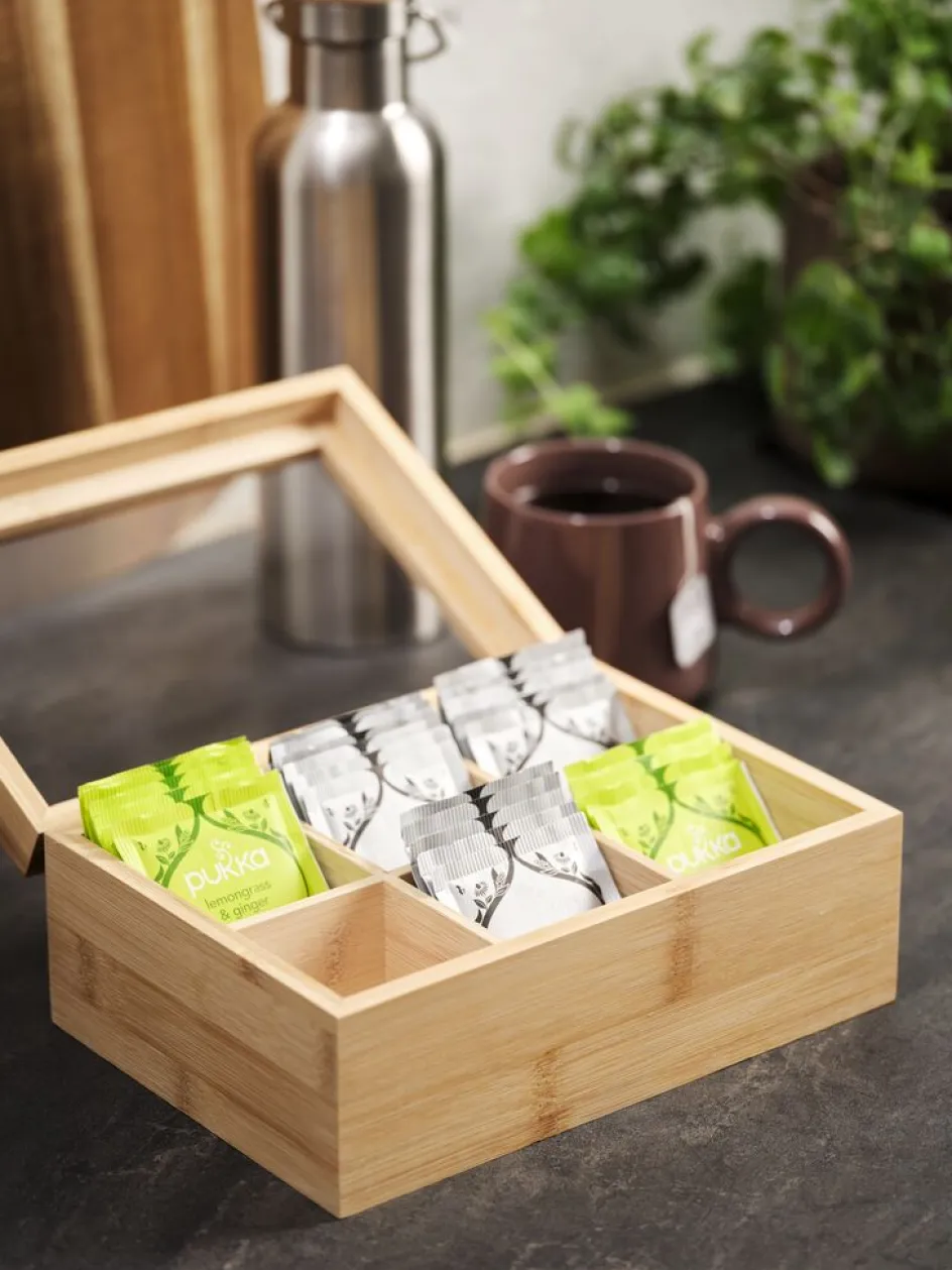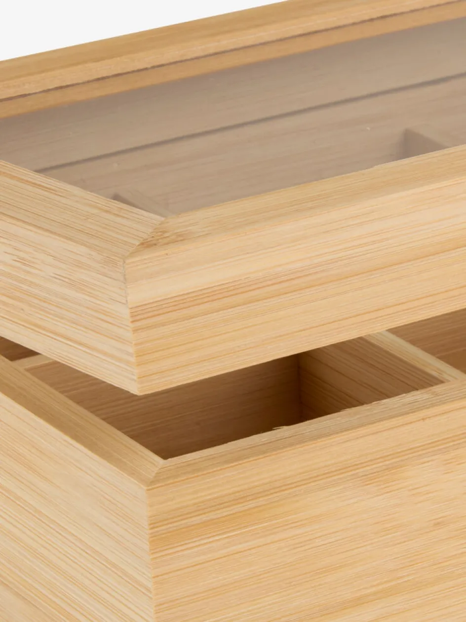 Boîte à thé en bambou naturel avec six compartiments pour organiser soigneusement votre collection de thés. Un couvercle transparent vous permet de voir facilement le contenu. l16 x L23 x H9 cm