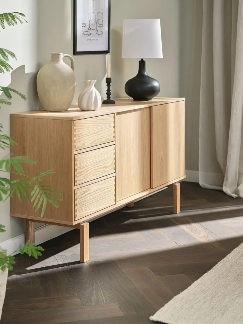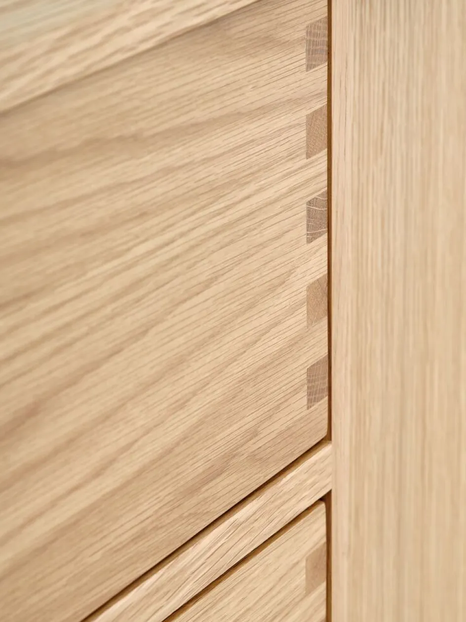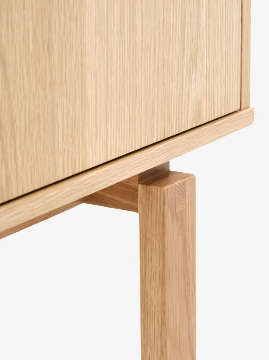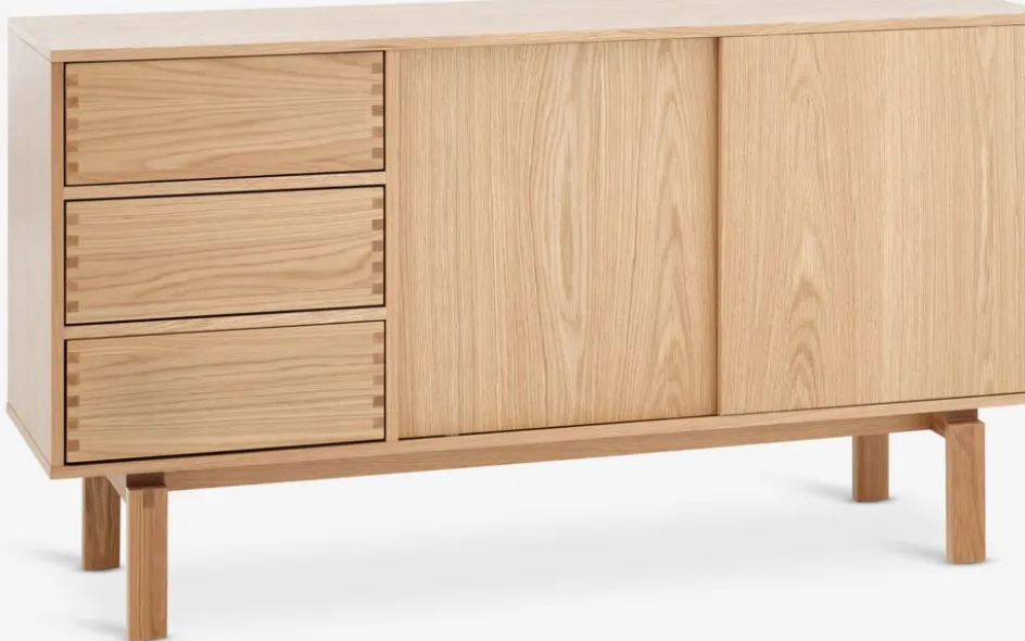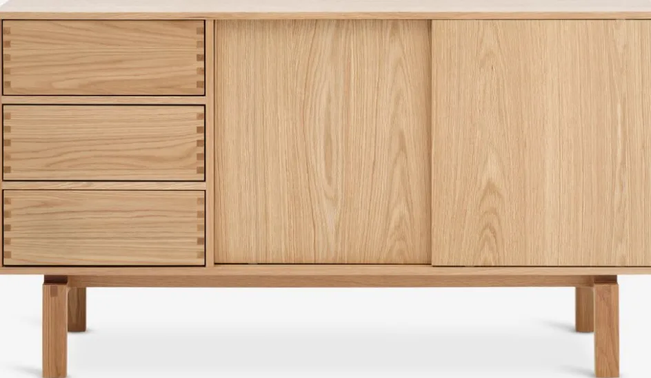 Chêne massif et placage chêne. Avec portes coulissantes. Tiroirs push-open. l140 x H77 x P40 cm