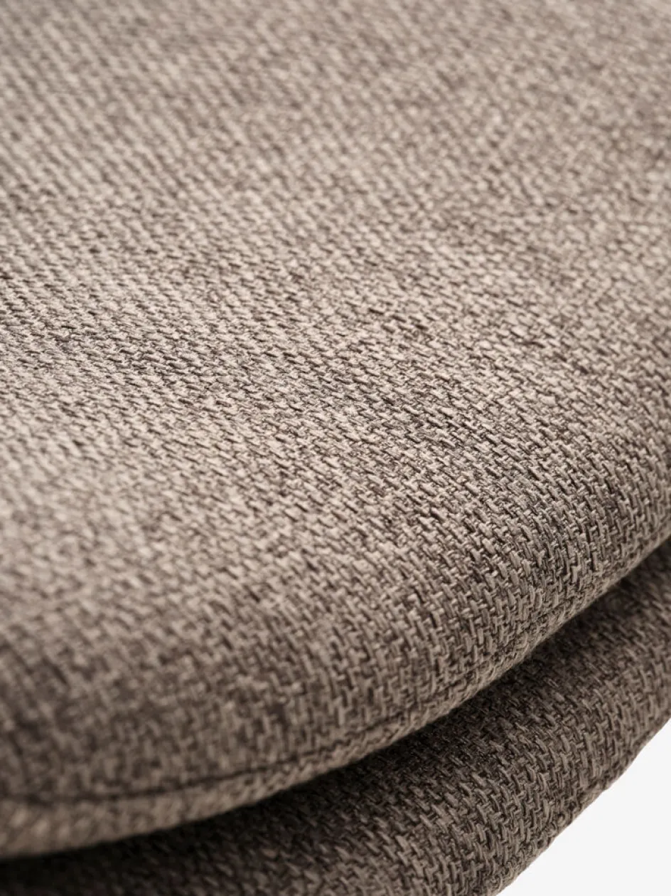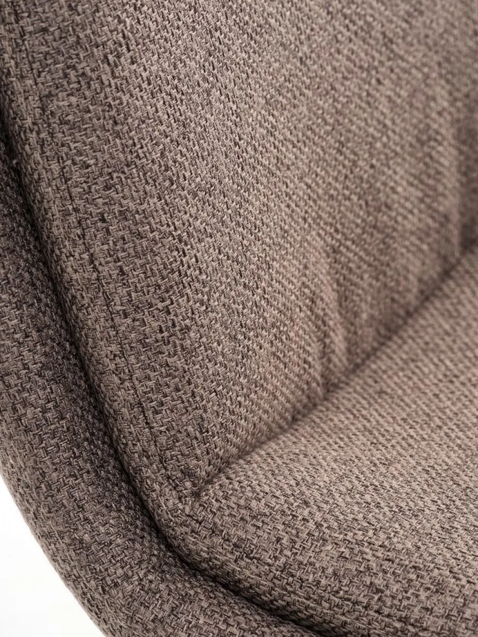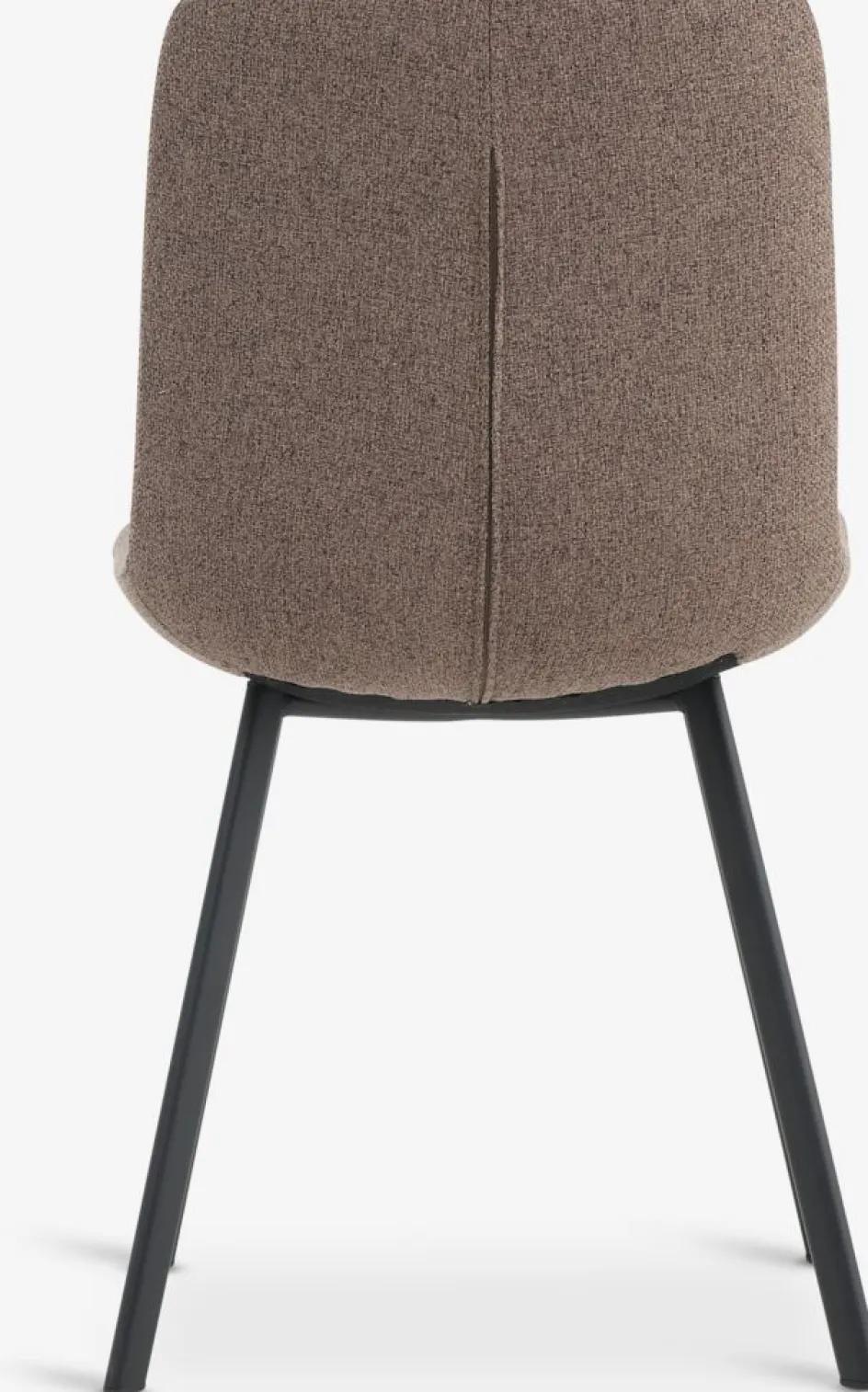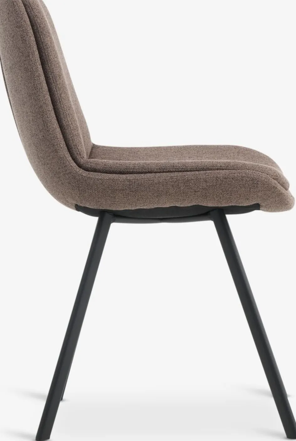 Chaise de salle à manger avec assise et dossier rembourrés en tissu brun clair. Pieds noirs en acier.
