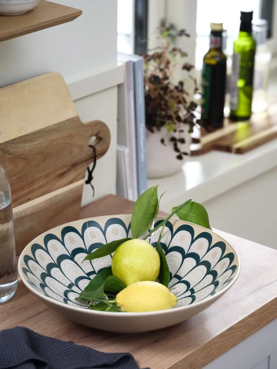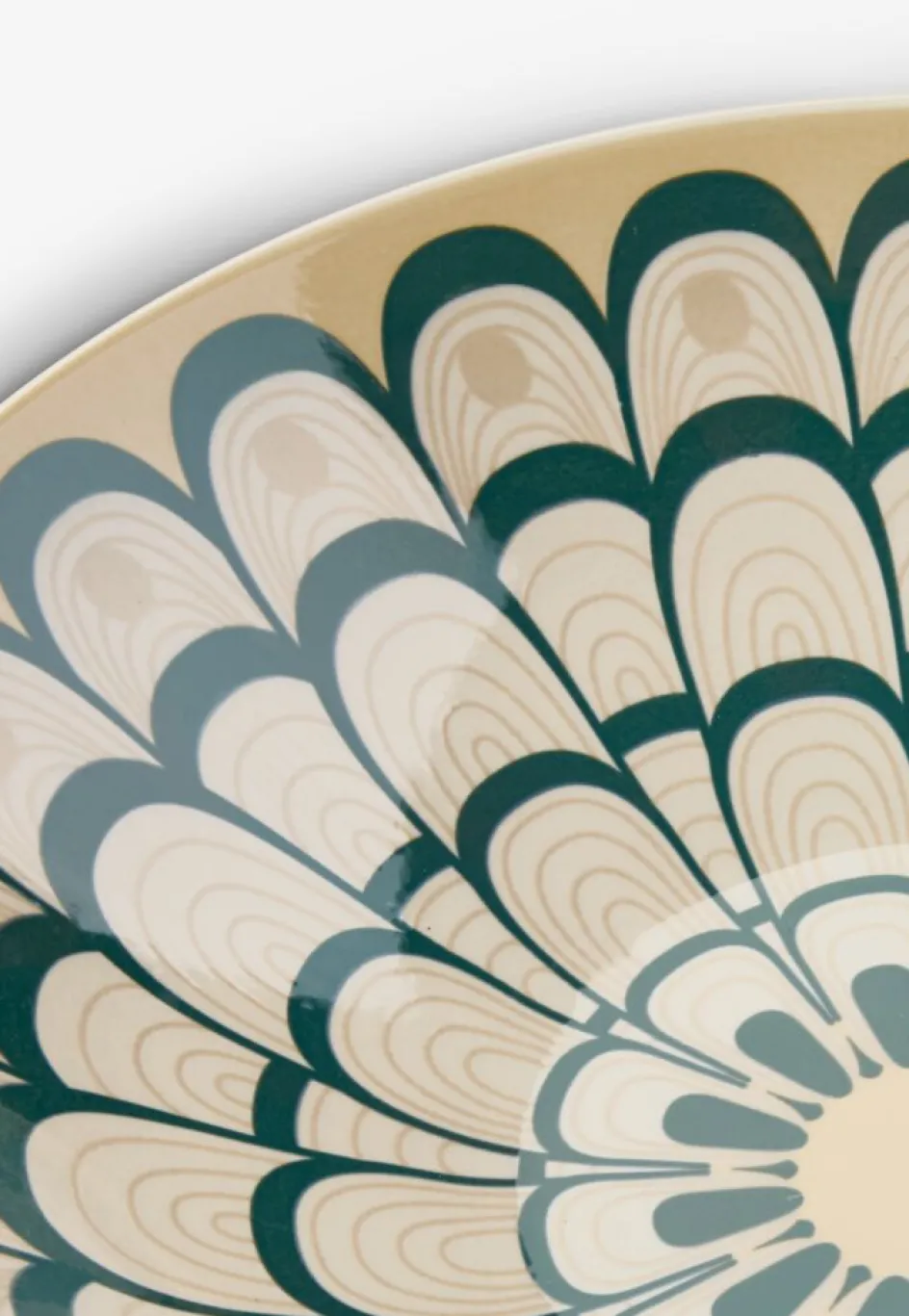 Bol en grès à la forme arrondie classique et avec un motif exotique aux couleurs chaudes. Ce grand bol est idéal pour une salade ou simplement comme élément décoratif. Résistant au lave-vaisselle. Ø30 x H9 cm