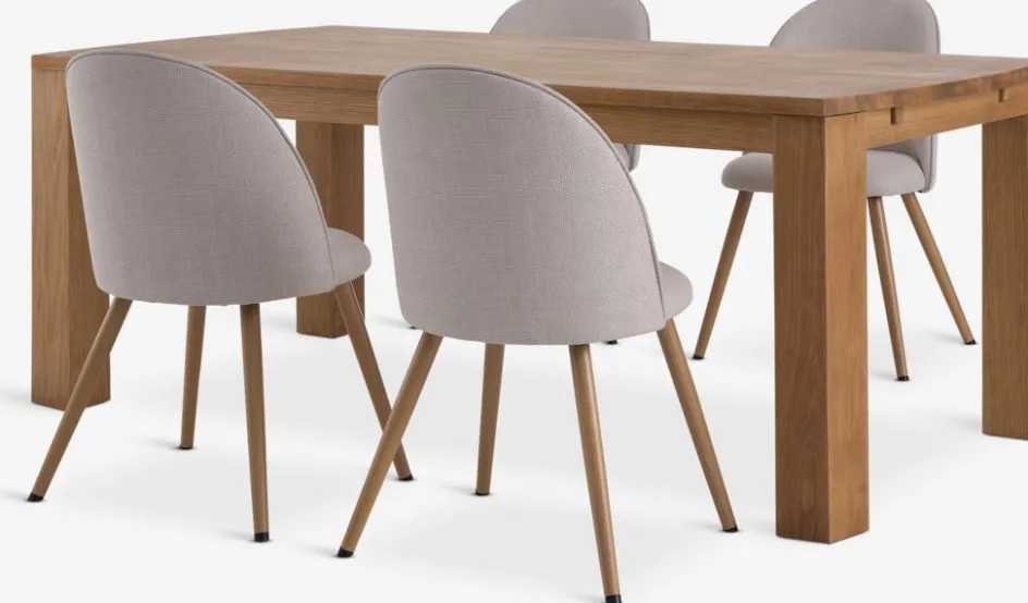 Table : plateau : panneau de particules, placage chêne, bouleau/chêne massif. Pieds : panneau de particules, placage chêne, chêne massif. Excl. rallonges. l100 x L200 x H75 cm. Chaise : contreplaqué. Revêtement : polyester. Garnissage : mousse polyuréthane (18/20 kg/m³). Pieds : acier. l52 x H84 x P54 cm