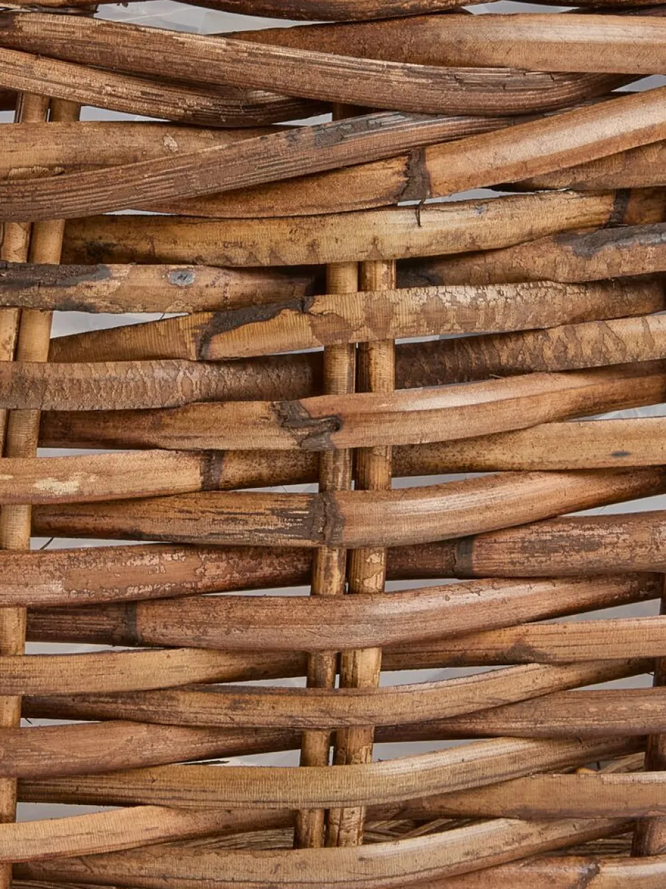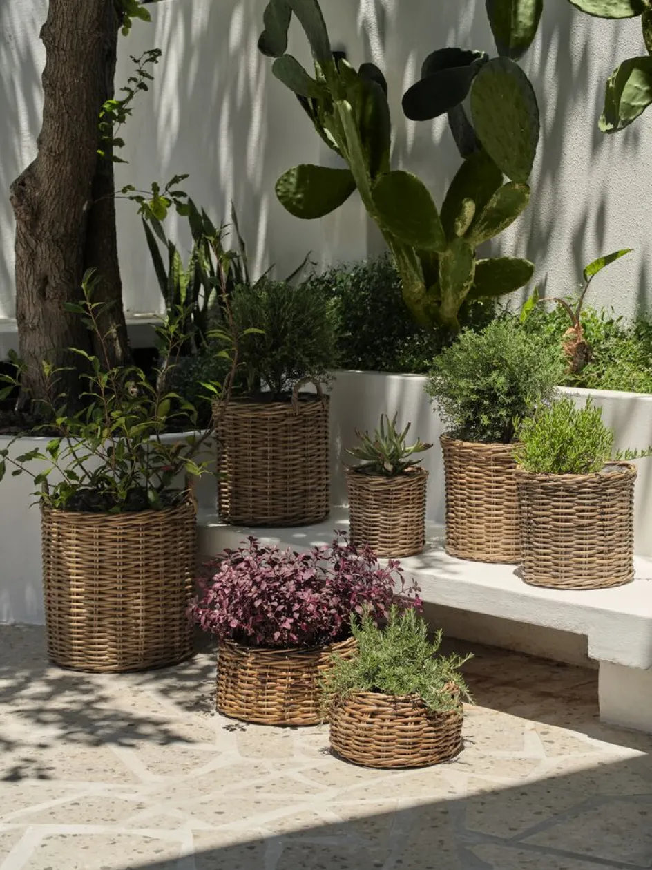Panier pour plantes en lot de deux, tressé en kubu naturel et rotin pour un aspect rustique et texturé. Chaque panier est fourni avec une doublure en plastique pratique pour y placer les plantes. Ø49/35 x H23/19 cm