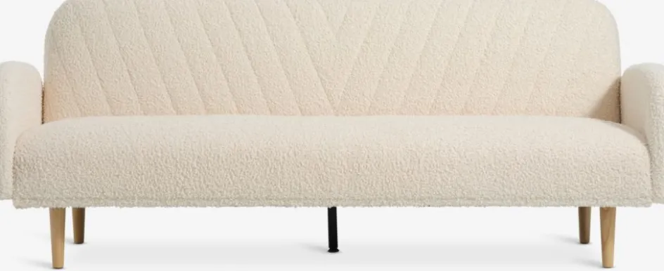 Canapé 3 places en tissu Teddy. Le canapé se convertit facilement en lit. Assise et dossier en mousse. Pieds en bois massif. Couchage: 106×190 cm. l209 x H82 x P83 cm