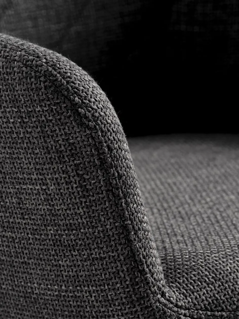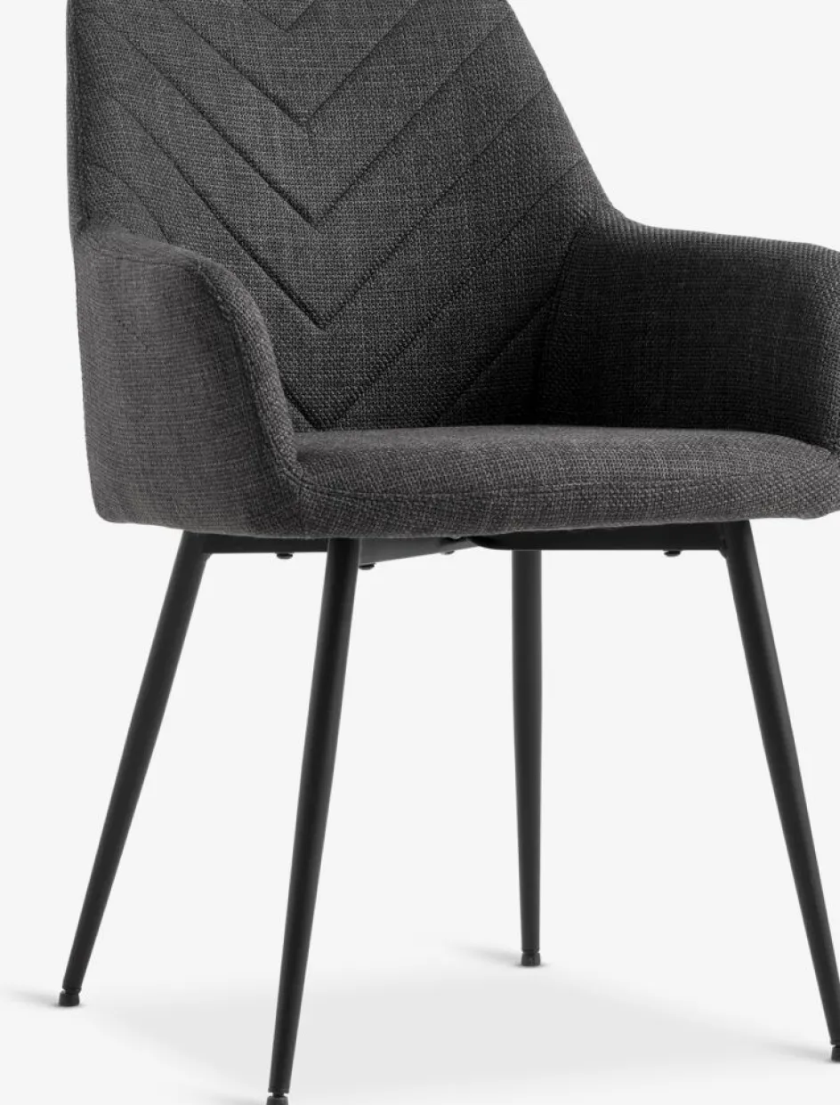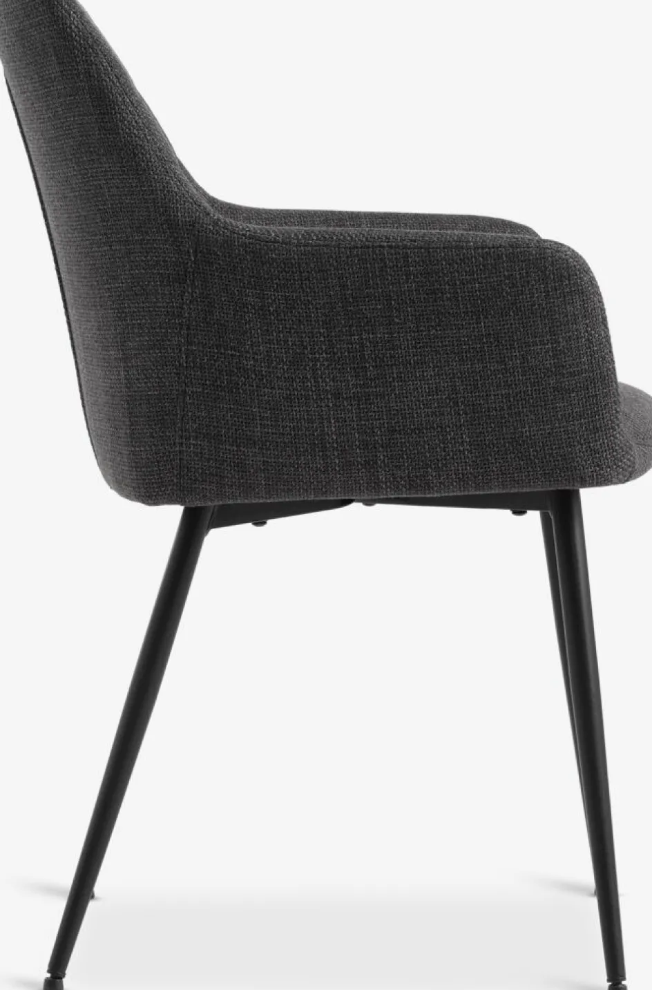 Chaise de salle à manger avec accoudoirs offrant un soutien et un confort supplémentaires. Assise rembourrée et dossier en tissu gris foncé. Pieds en acier noir.