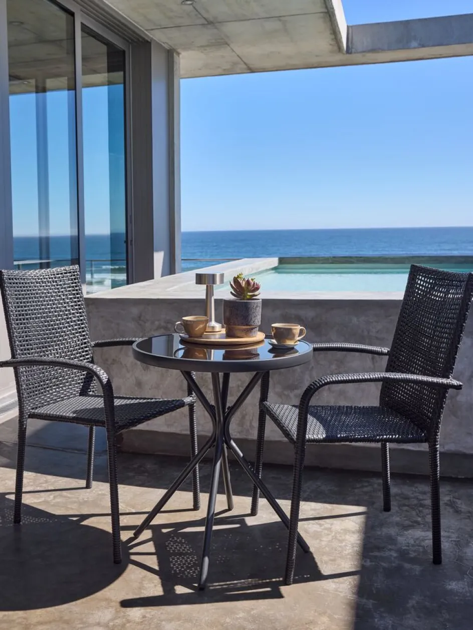 Table bistrot ronde avec plateau verre trempé et pieds noirs en acier peint par poudrage. Ø60 x H70 cm