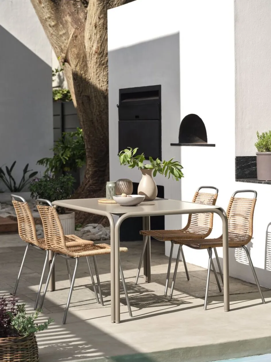 Table de jardin avec un plateau en verre trempé couleur sable foncé. Le cadre et les pieds assortis sont en acier peint par poudrage. l90 x L140 x H74 cm