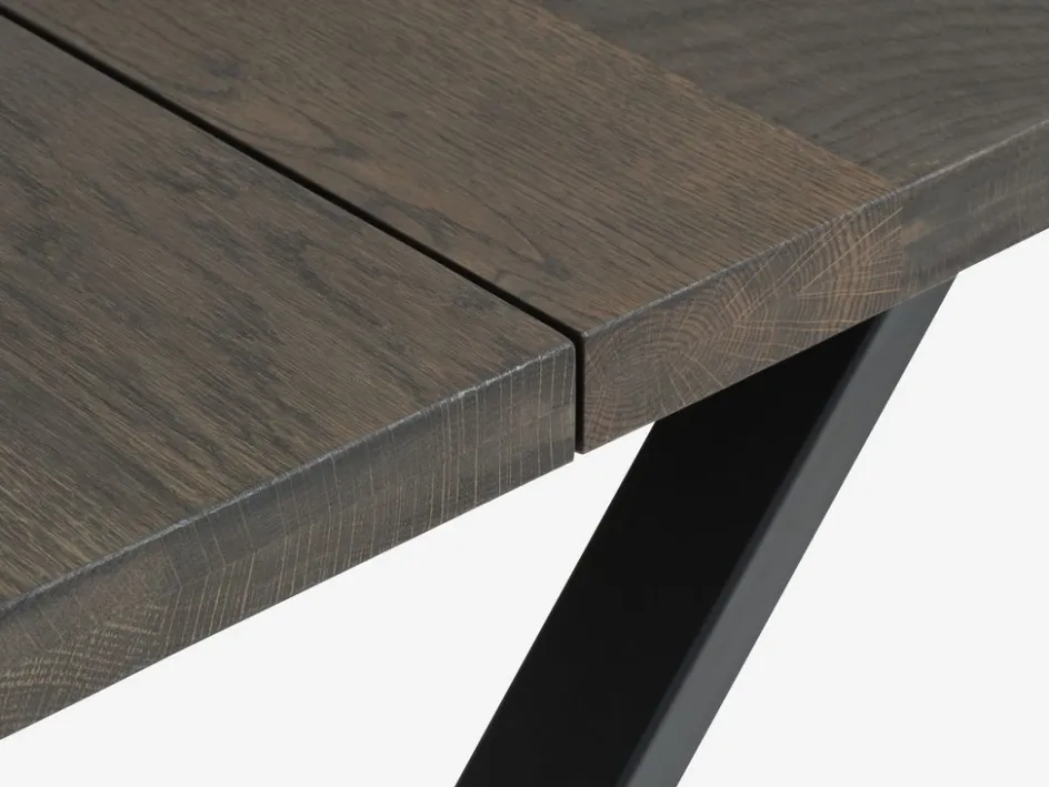 Partie supérieure : chêne massif. Pieds : acier. l80 x L140 x H75 cm
