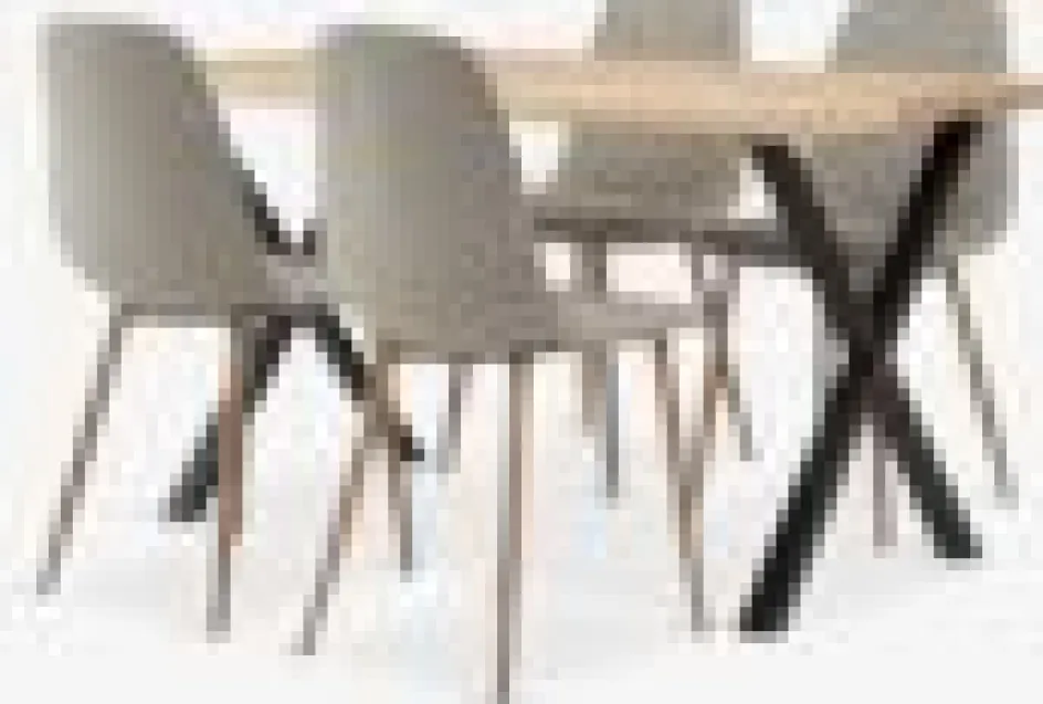 Table: Chêne massif et acier. Excl. rallonges. l95 x L200 x H75 cm. Chaise: Tissu et acier.
