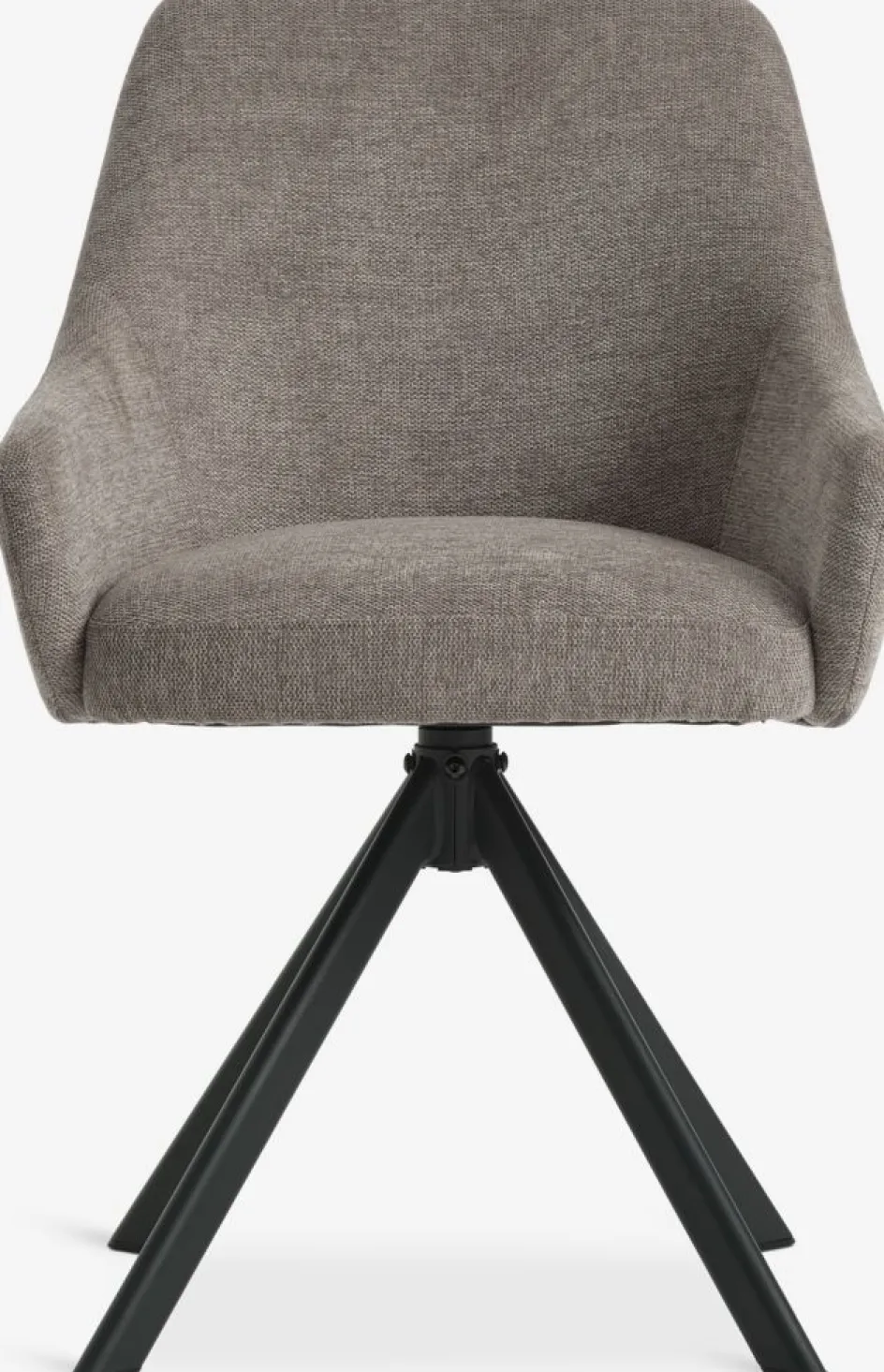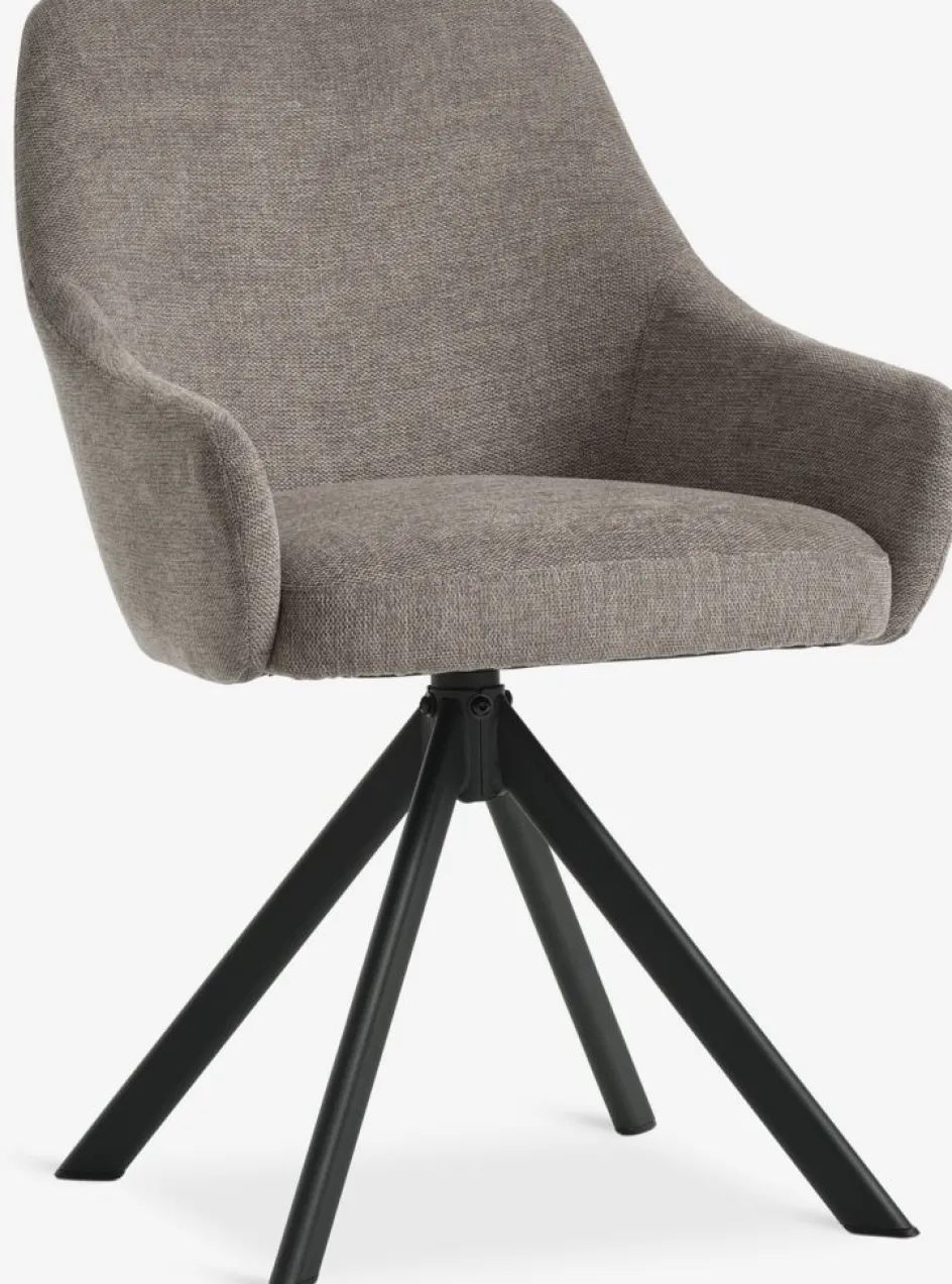 Chaise de salle à manger avec accoudoirs offrant un soutien et un confort supplémentaires. La chaise possède une assise rembourrée et un dossier en tissu beige. La base pivotante en acier noir permet à la chaise de tourner facilement.