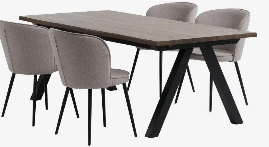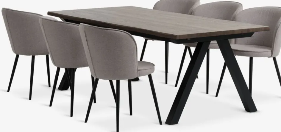Table : bois massif et placage chêne. Excl. rallonges. l100 x L210 x H75 cm. Chaise : tissu et acier.