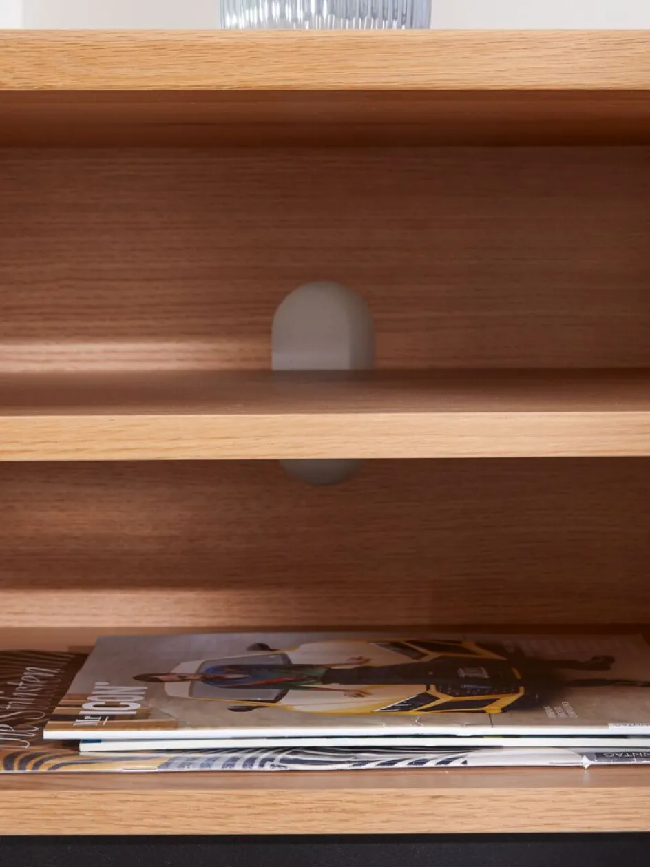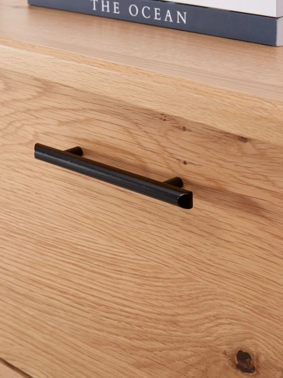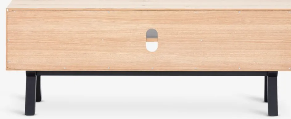 Bois massif et placage chêne. Portes soft-close. Tiroirs avec glissières d’extension complète. l150 x H55 x P43 cm