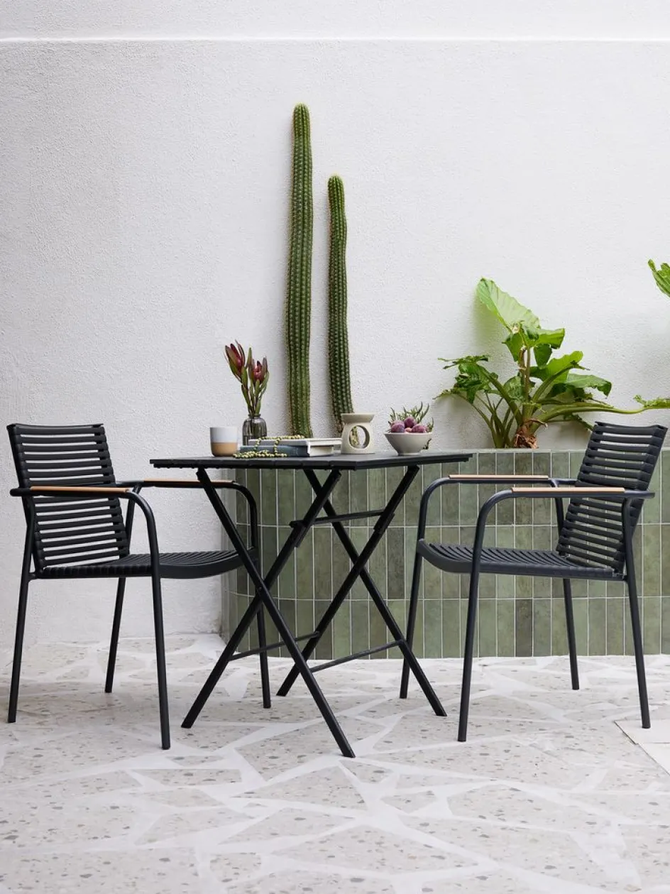 Ensemble bistrot 2 personnes. Table : acier et imitation bois. Pliable. l65 x L65 x H73 cm. Chaise : aluminium et plastique résistant aux UV. Empilable.