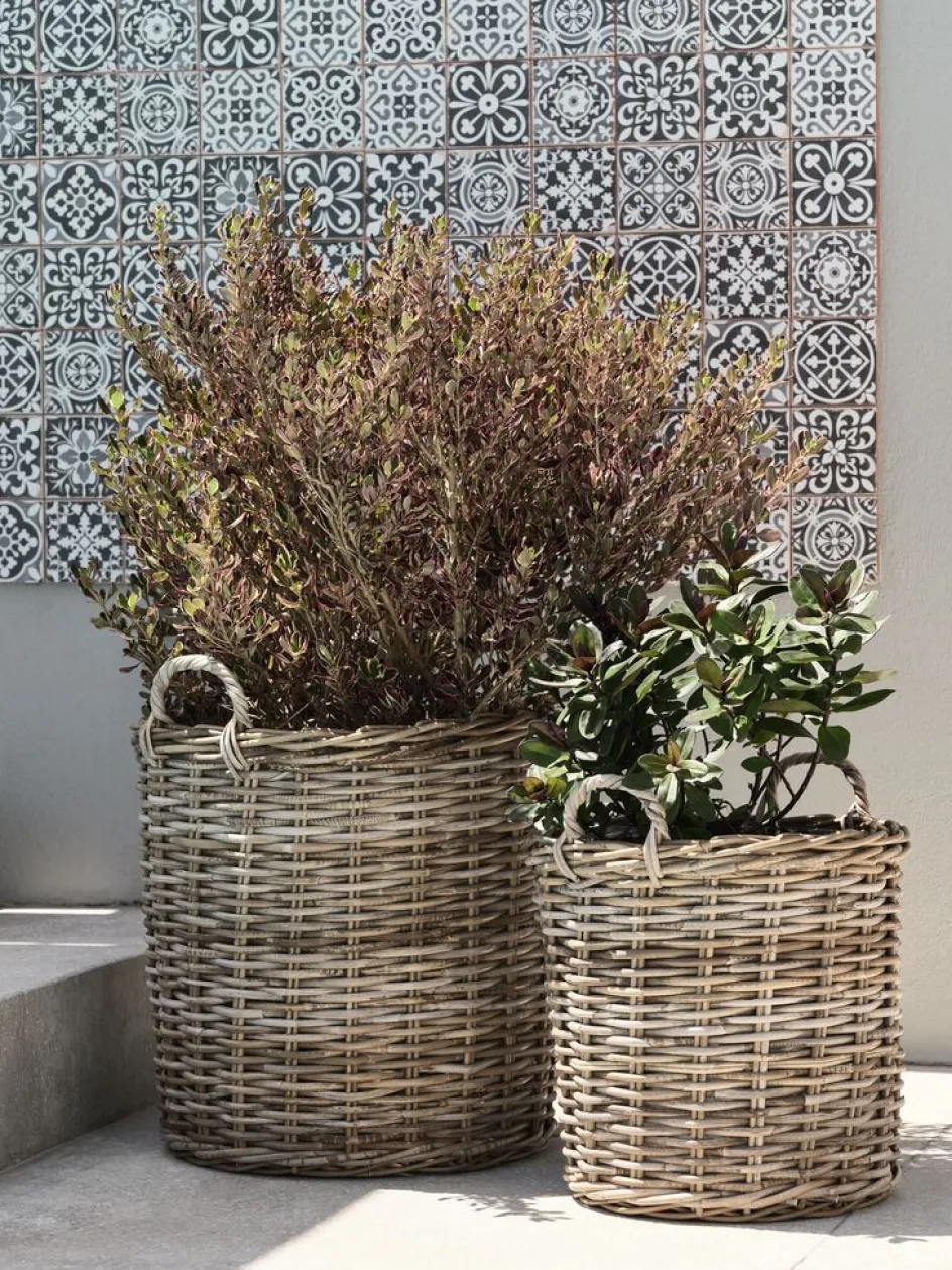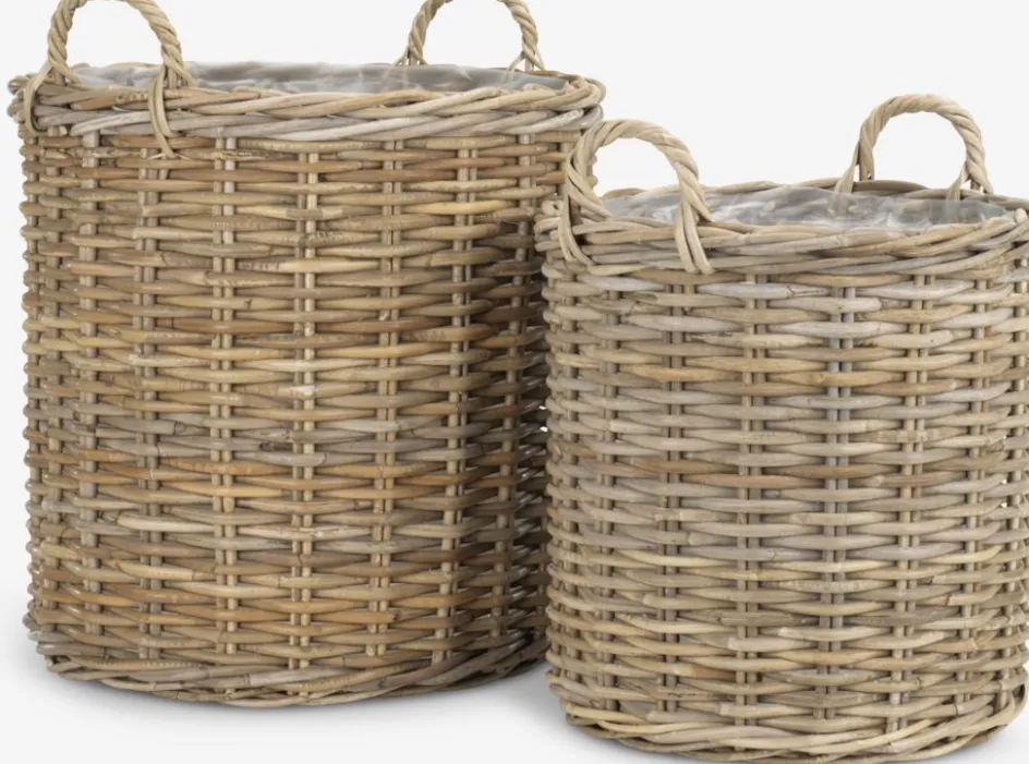 Lot de 2 paniers pour plantes en kubu tissé et rotin avec une doublure en plastique. Ces paniers polyvalents et rustiques sont idéaux pour les plantes ou le rangement décoratif. Les poignées facilitent le déplacement des paniers et leur placement selon vos envies. Ø50/40 x H58/48 cm