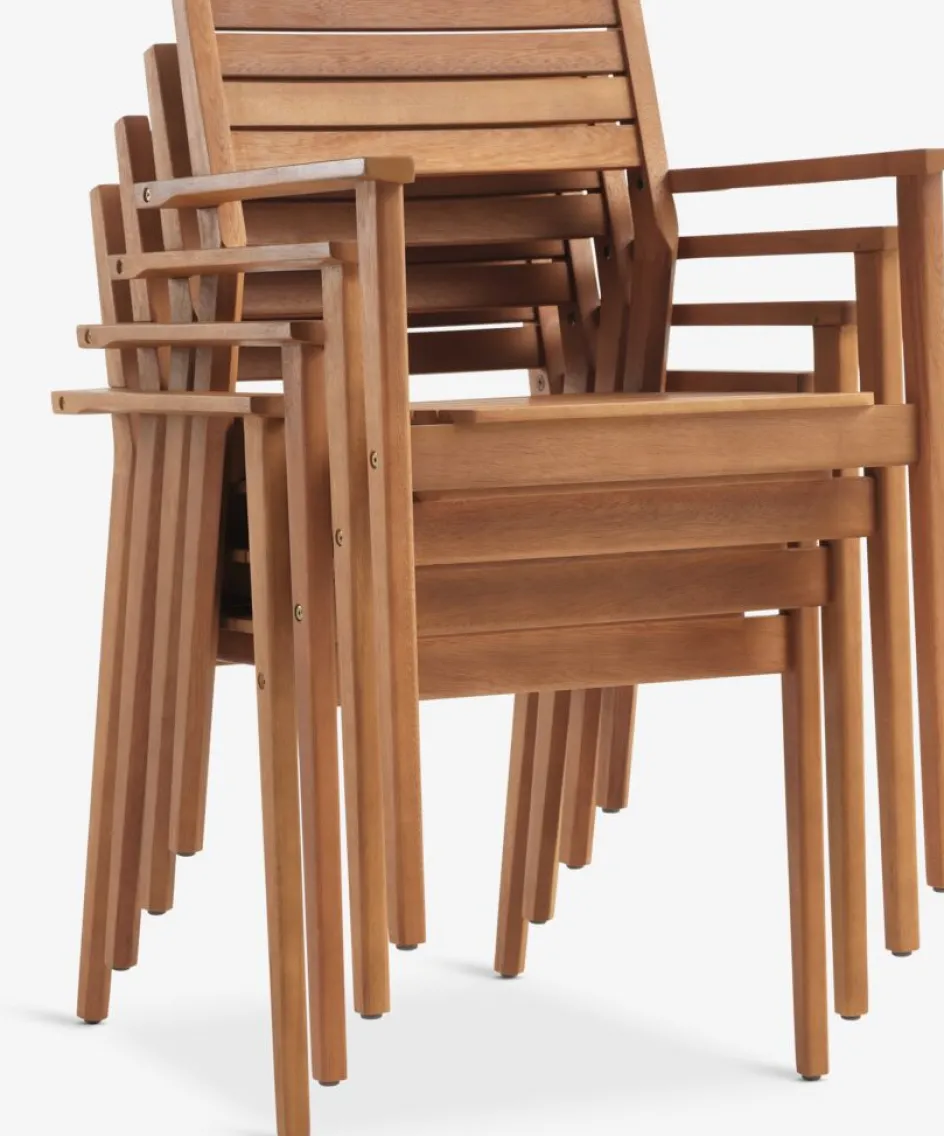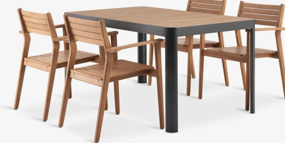 Ensemble meubles de jardin 4 places. Table: Aluminium et bois dur FSC® huilé. l91 x L149 x H75 cm. Chaise: Bois dur FSC® huilé. Empilable.