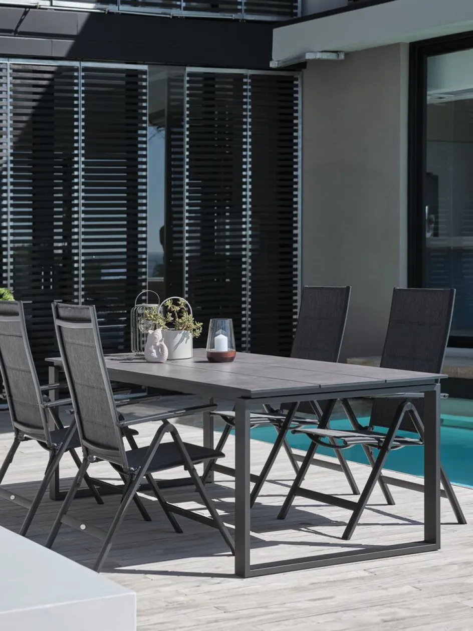 Ensemble de meubles de jardin 4 personnes. Table : aluminium et bois composite DURAWOOD®. Le DURAWOOD® est un matériau composite durable composé de fibres de bois dur FSC® et de plastique. l100 x L215 x H75 cm. Chaise : aluminium, textilène et rembourrage mousse à séchage rapide. 6 positions. Pliable.