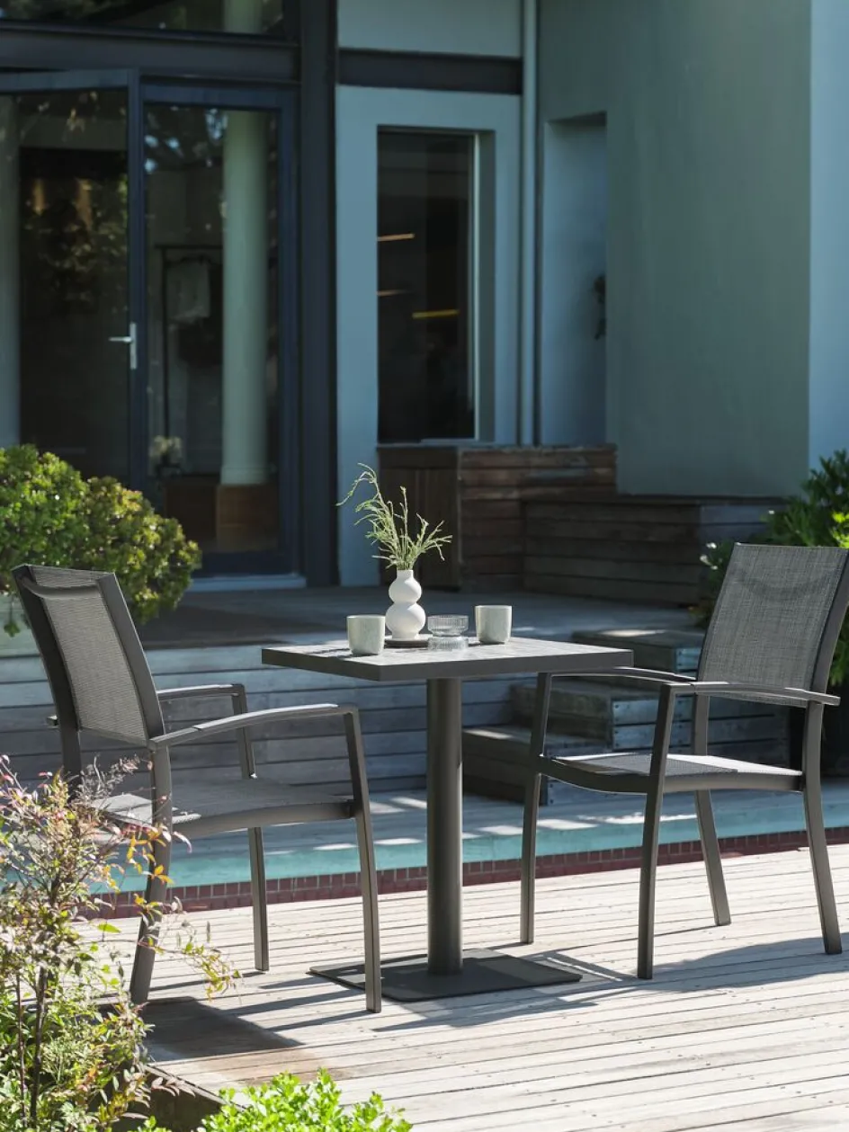 Ensemble bistrot 2 personnes. Table : aluminium, acier et céramiques. l59 x L60 x H71 cm. Chaise : aluminium et textilène. Empilable.