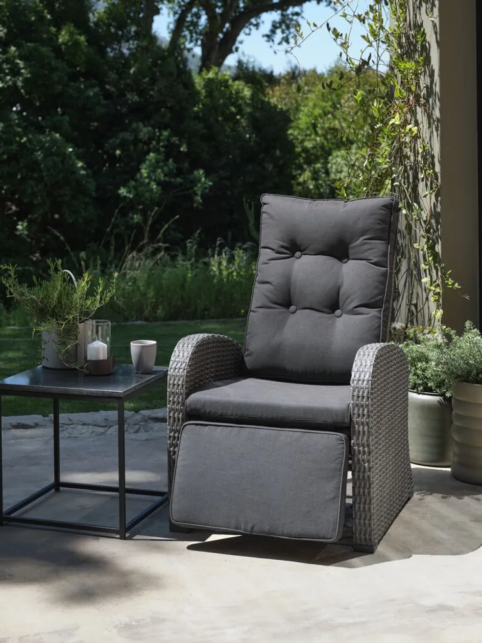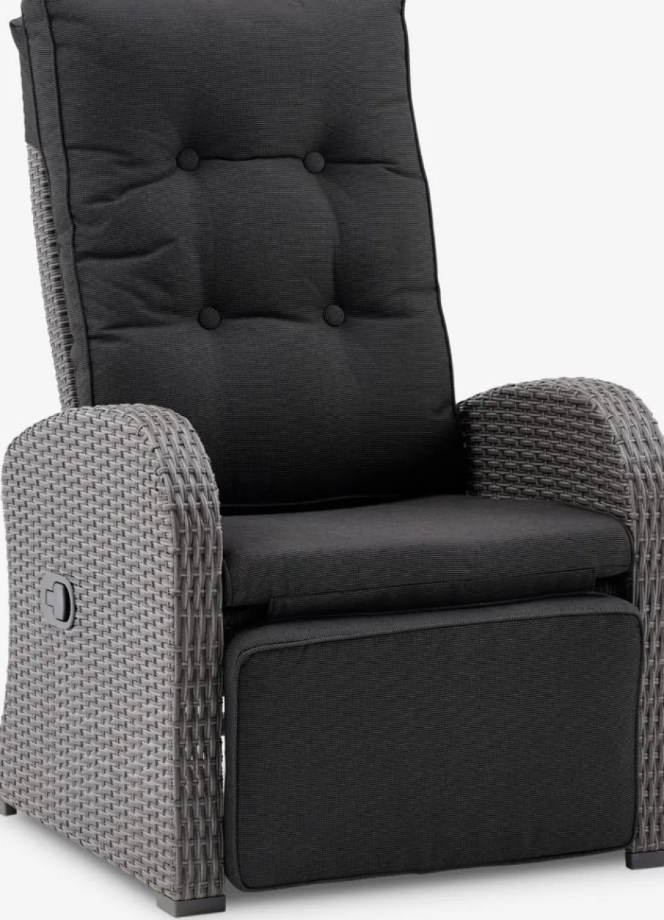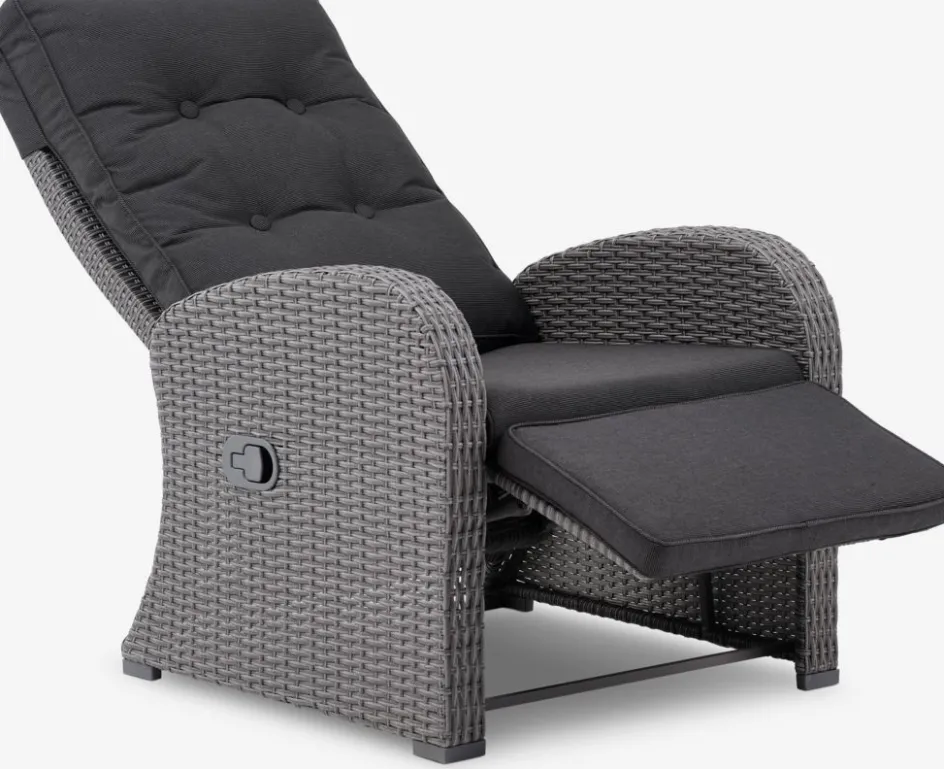 Fauteuil lounge en aluminium et polyrotin. Réglage continu du dossier et du repose-pied. Incl. coussin haut de gamme avec housse résistante à structure tissée. l66 x H102 x P78 cm