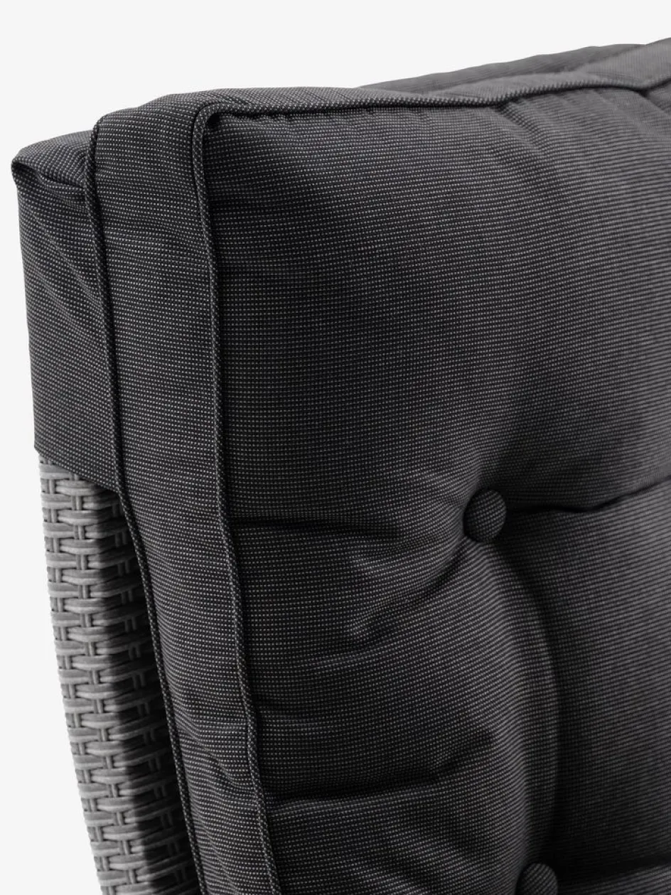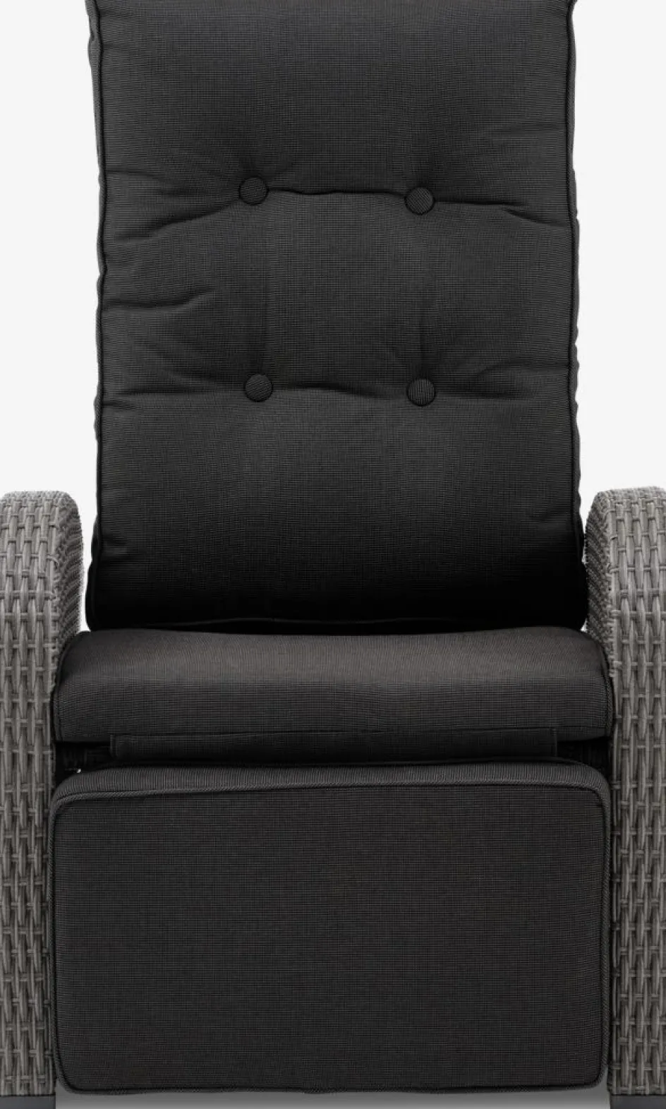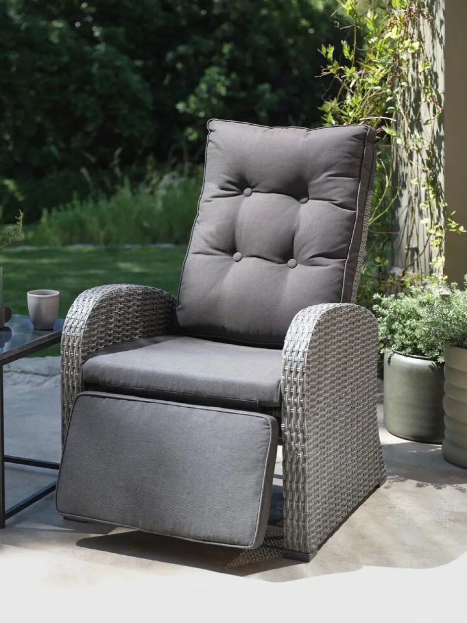 Fauteuil lounge en aluminium et polyrotin. Réglage continu du dossier et du repose-pied. Incl. coussin haut de gamme avec housse résistante à structure tissée. l66 x H102 x P78 cm
