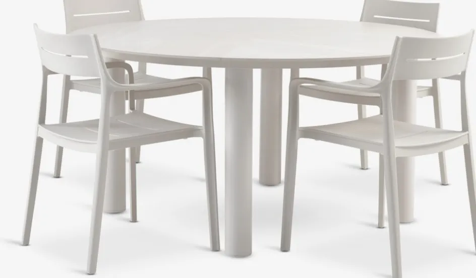 Ensemble meubles de jardin 4 places. Table: Aluminium et pierre frittée. Le plateau en pierre frittée résiste aux rayures, aux taches et à la chaleur. Ø150 x H74 cm. Chaise: Plastique résistant aux UV. Empilable.