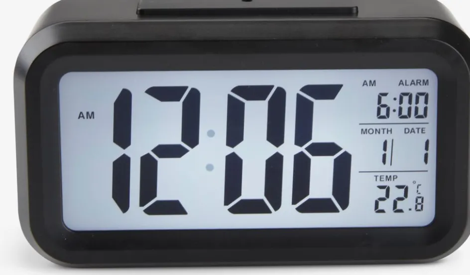 Réveil doté d’un écran numérique transparent qui affiche l’heure, la date et la température ambiante. Ce réveil noir compact dispose également d’un rétroéclairage et d’une fonction « snooze ». Nécessite 3 piles AAA, vendues séparément. l14 x L5 x H8 cm