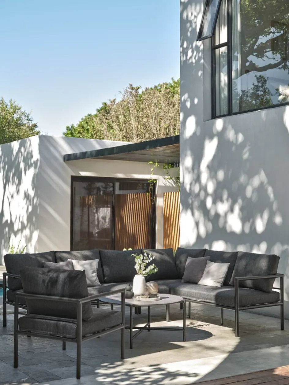 Le salon de jardin comprend un canapé d’angle 6 places, 1 fauteuil lounge et 1 table lounge. Ce salon d’extérieur assorti peut accueillir confortablement 7 personnes.