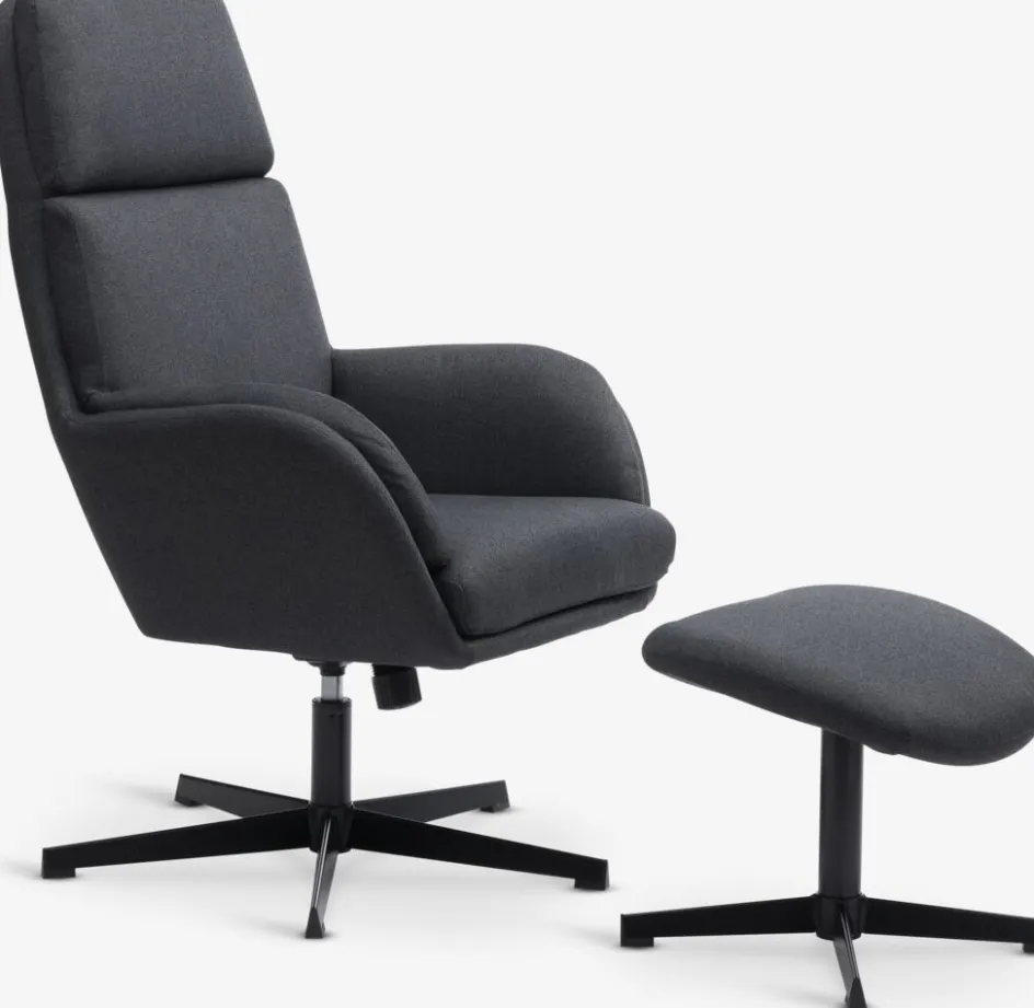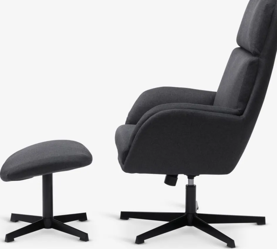 En contreplaqué, acier. Garnissage : mousse polyuréthane. Revêtement : polyuréthane. Base pivotante : acier. Inclinable. Incl. repose-pieds. l70 x H107 x P77 cm