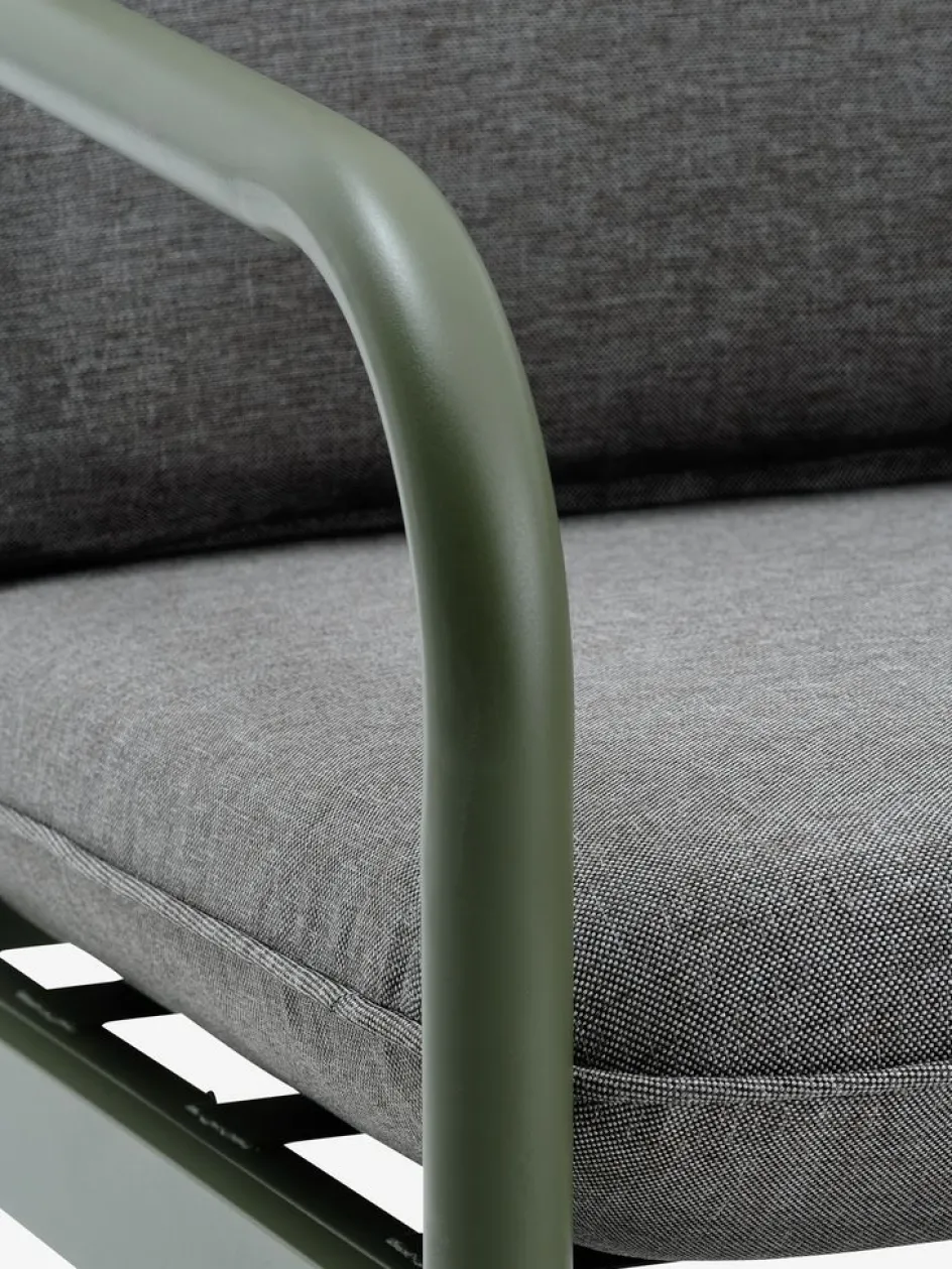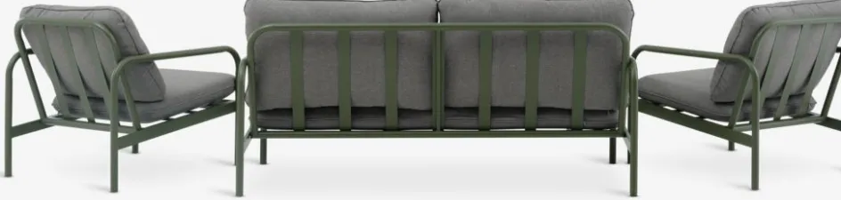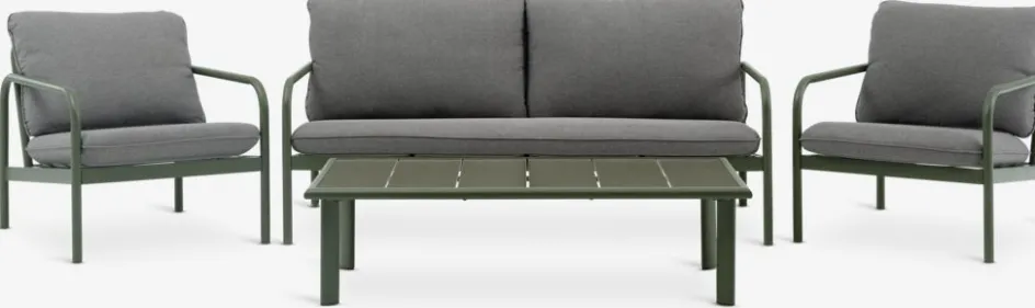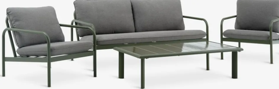 Apportez détente et esthétique moderne à votre espace extérieur avec l’ensemble lounge TEGLUM. Cet ensemble de jardin 4,5 places vert olive comprend un canapé et 2 fauteuils avec des coussins confortables, ainsi qu’une table lounge assortie avec un plateau en céramique.