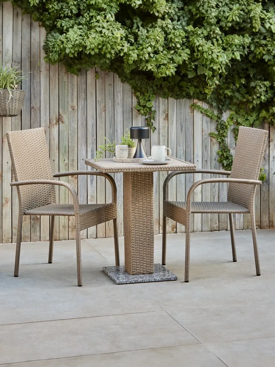 Ensemble bistrot 2 places. Table : aluminium, granit, polyrotin et imitation bois. l60 x L60 x H74 cm. Chaise : acier et polyrotin. Pliable.